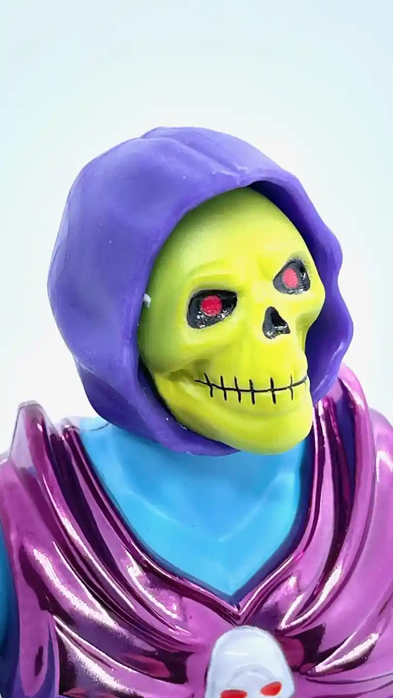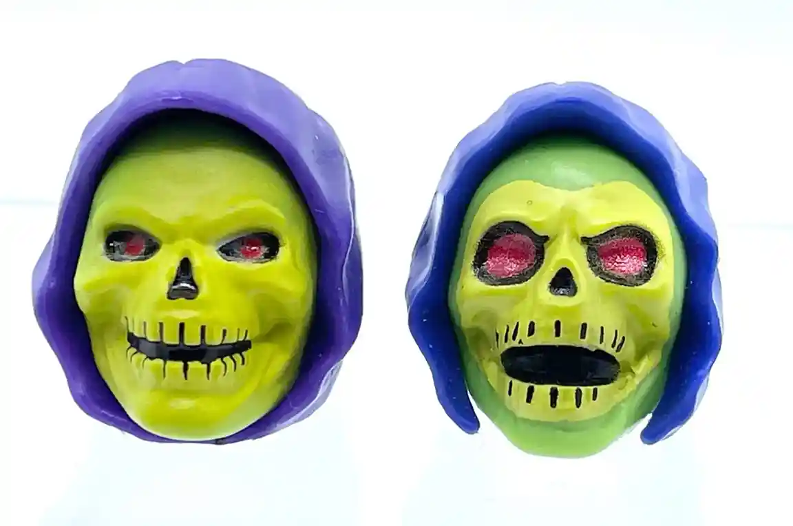 The main difference between the new TC Skelly head sculpt and the previous version is that the hood is more of a purple, making his other head sculpt look blue. Also, the hood completely wraps around the chin and does not have a gaping look like the first release.