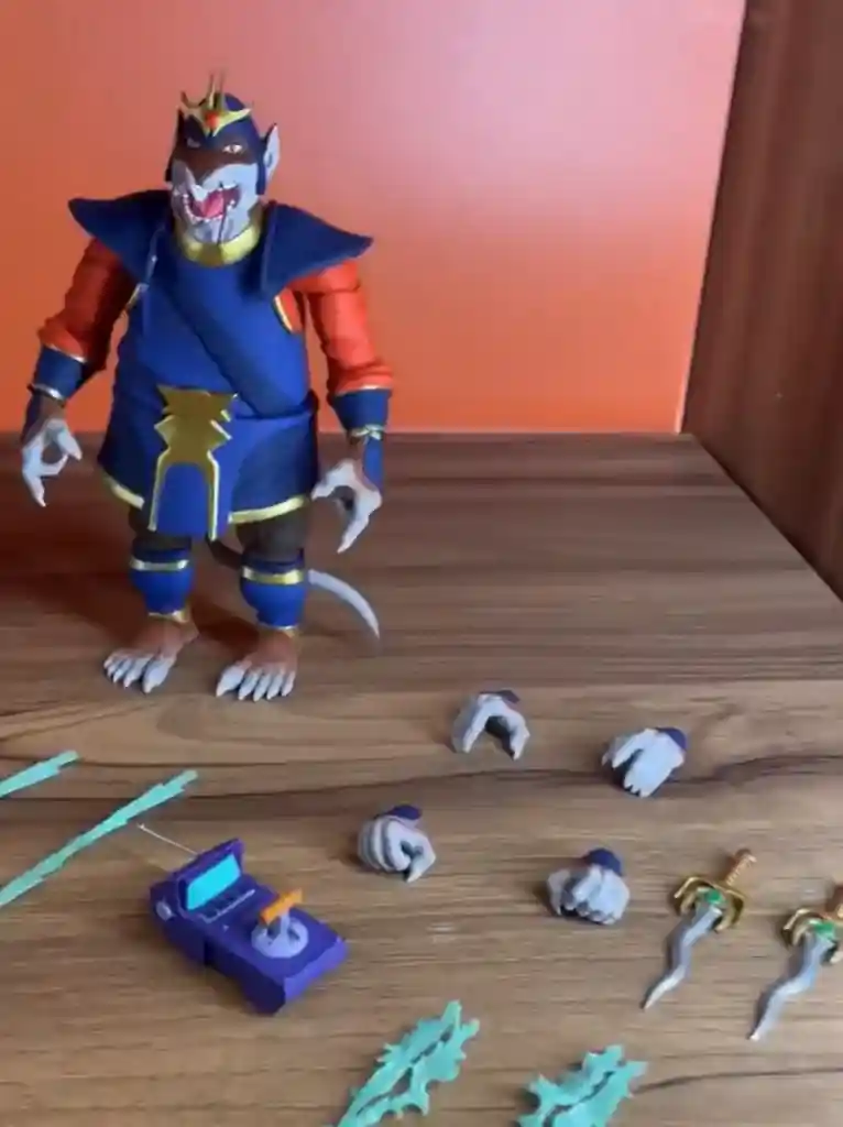 Ratar-O is seen in his deep blue Samurai outfit and shown on display with an open mouth sculpt. Given Super7’s propensity to include alternate head sculpts, we think that there will be at least one more once this goes into final production. He comes with two extra sets of hands, his signature daggers, some lightning energy effects, and remove control device.