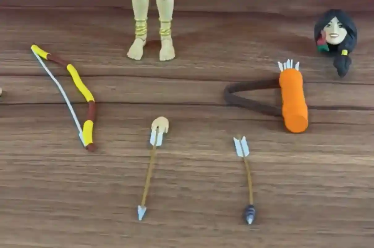 She comes with her bow, two arrows, her quiver, and 6 alternate hands.