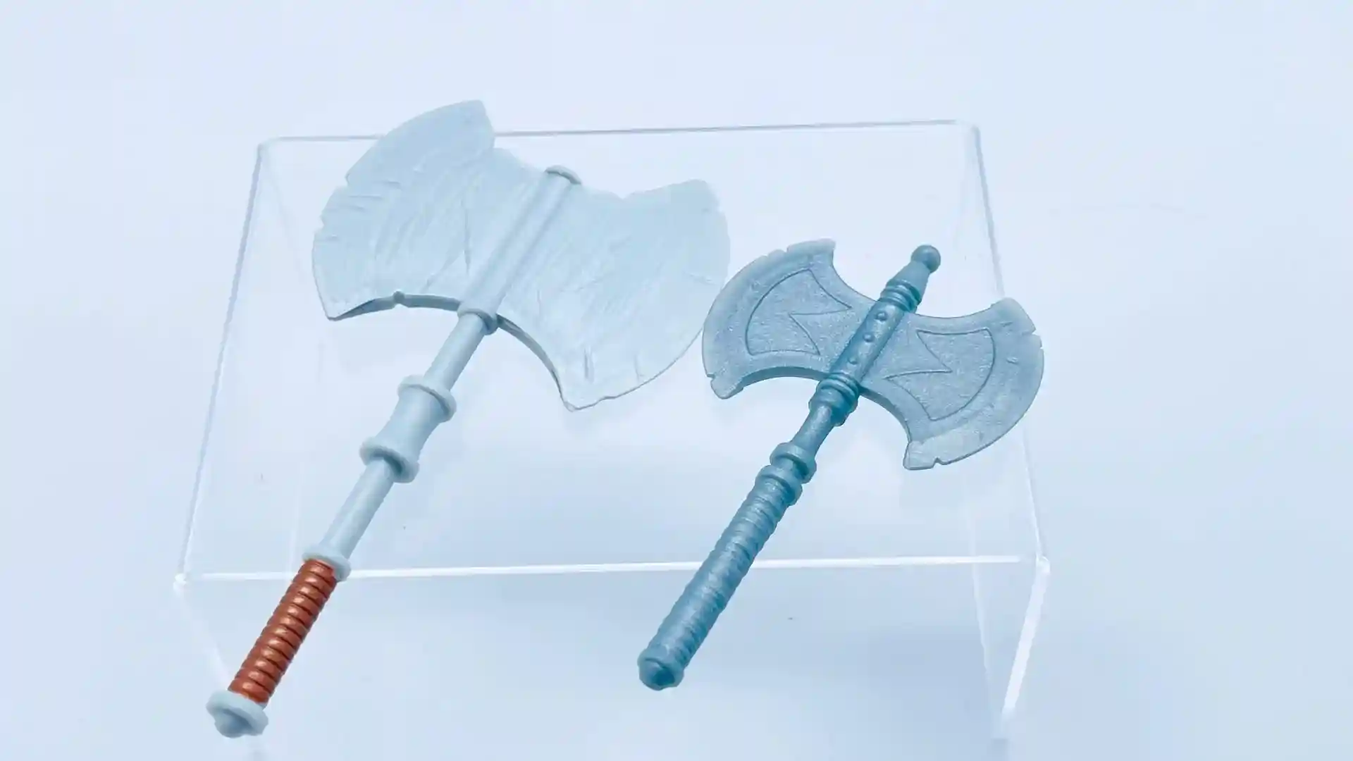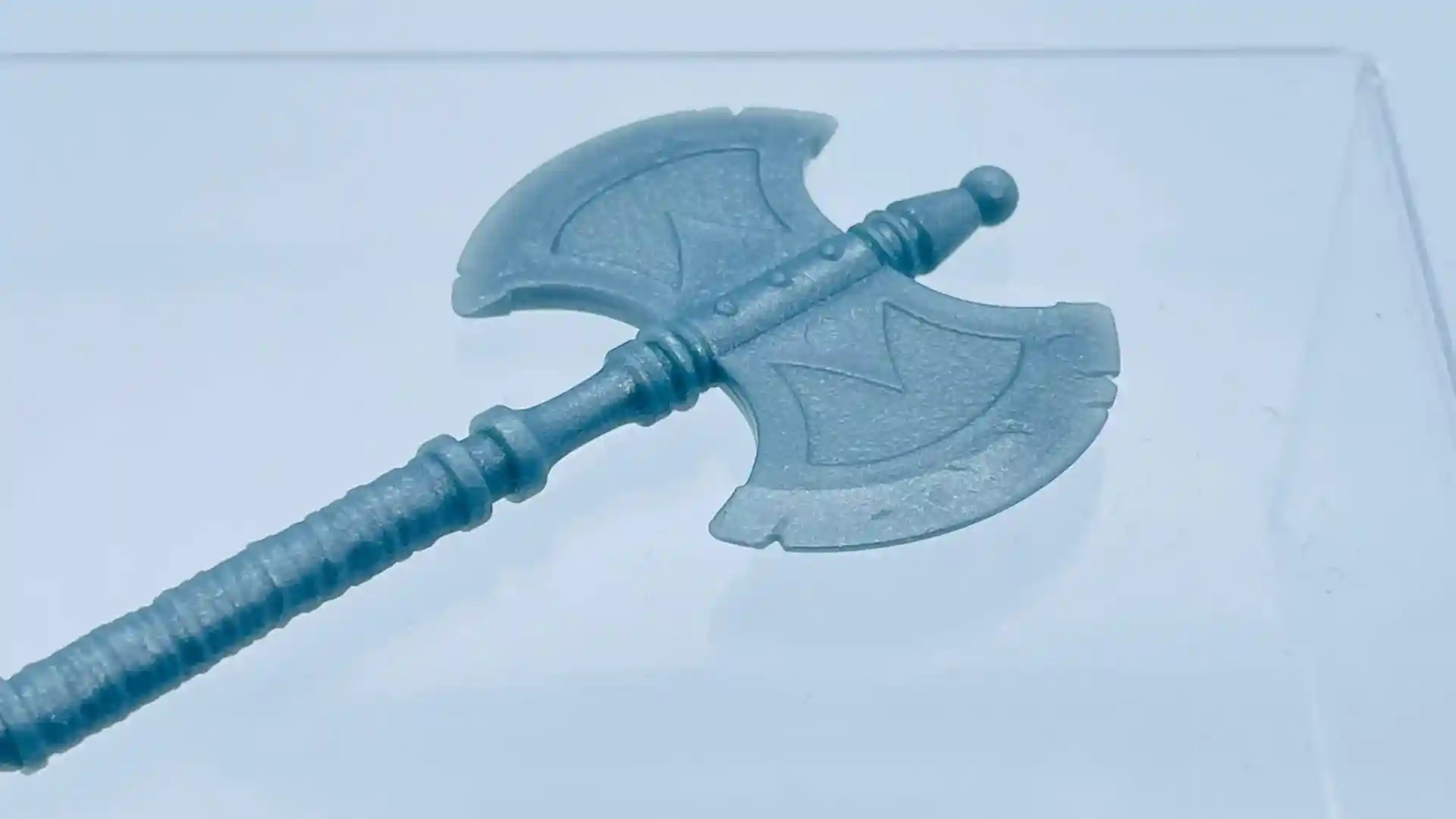 This is the second double bit axe in the Masterverse line with the first being from Savage He-Man. It resembles a Lybrys from Ancient Greece although this version is less ornate. This version of the axe looks more refined and forged vs. the one that came packed with Savage He-Man. For example, the cheek (which are the sides of the axe head), has some defining lines and design. Both bits have sharp edges, which are used for battle versus chopping down trees.