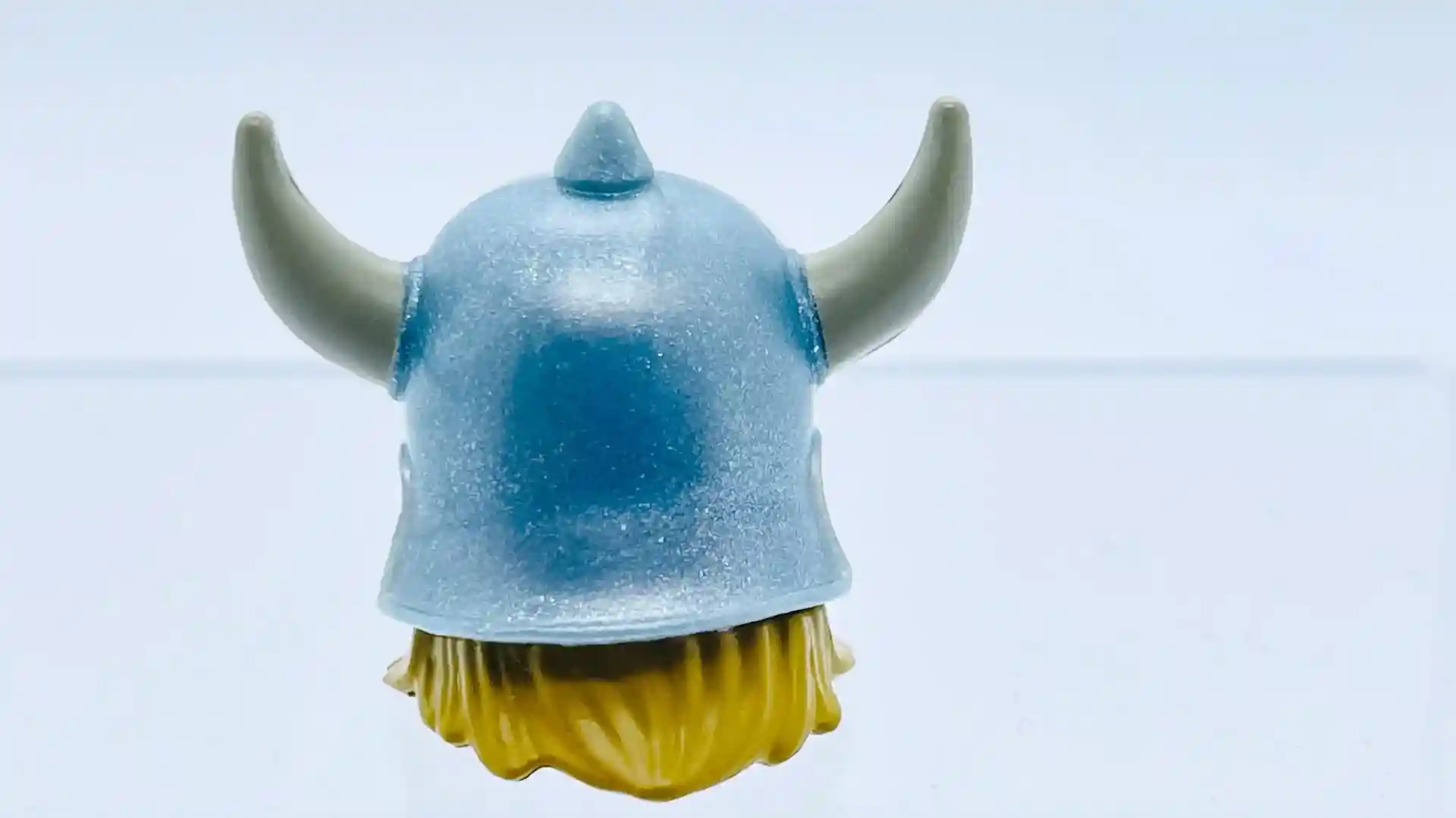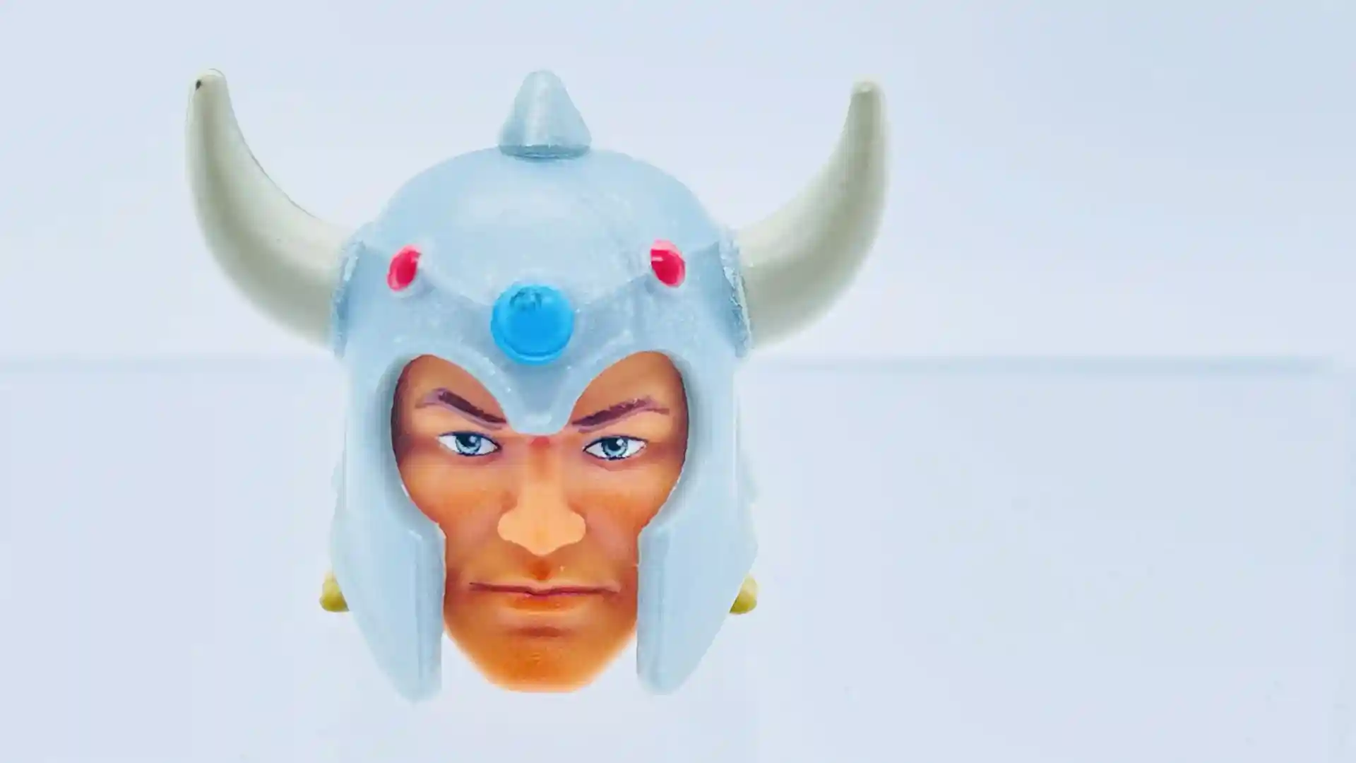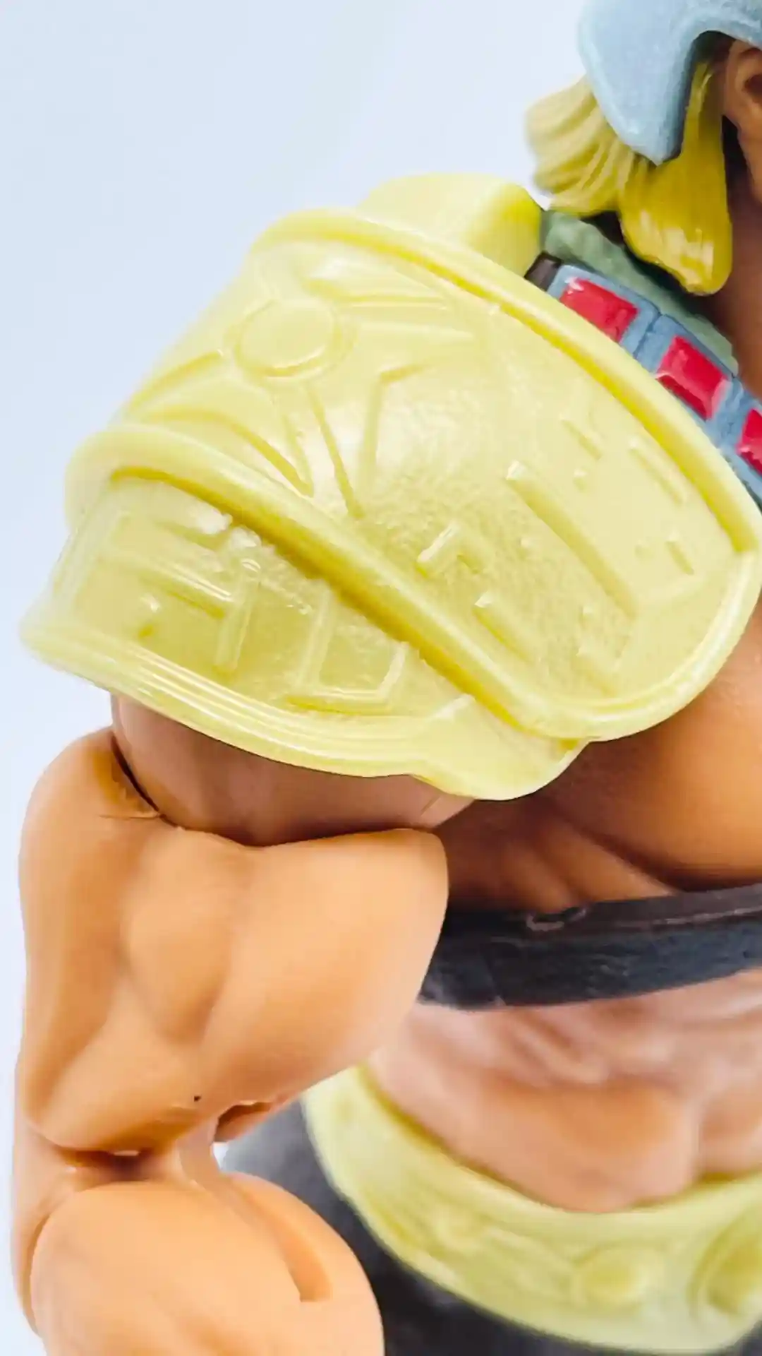 The viking helmeted head sculpt gives He-Man a very unique look and I love how form fitting it is! The helmeted is cast in a silver colored plastic with a nice blue jewel smack dab in the center with some red accents. The horns look like they are ivory and have a great shape! The helmet cut out around the face has a great shape where you can see his face from the eyes down. No hair shows through the front but you can see it peaking out of the back.