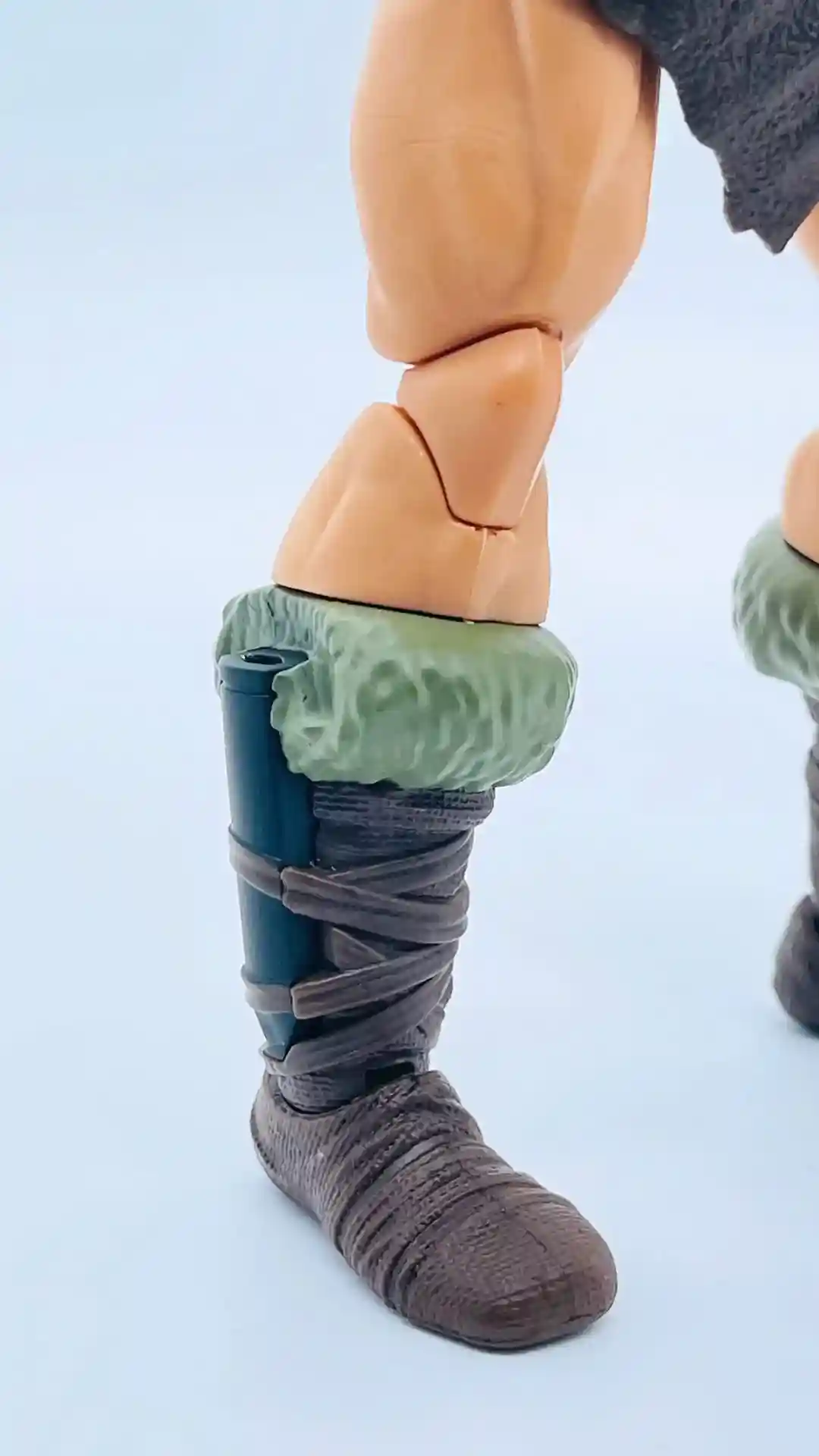 The legs are made from the standard Masterverse buck but the boots are a new design to accommodate the dagger. The fur sits on top of the boot has also been modified as the fur does not spill over the top of it. The boots have a nice brown wrapped look to them with a nice sage green fur topping it, which goes great for the colors they use on Viking He-Man. His right boot sports a knife holster similar to the one that came on the 2019 SDCC MOTU Origins He-Man / Prince Adam 2 pack, which makes this standard release figure feel even more premium.