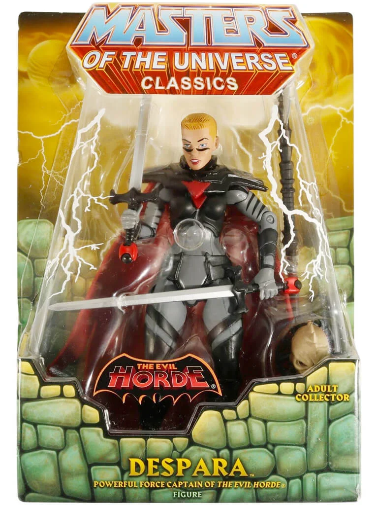 Despara’s MOTU Classics bio reads, “As a Horde Force Captain, Adora donned armor to resemble her “father” Hordak and became the fearsome warrior Despara. Enchanted by Shadow Weaver to forget inklings of mercy or independent thought, Despara was a living weapon for the Horde until her twin brother He-Man gave her the Sword of Protection and helped her become the heroic She-Ra. Many years later after Hordak’s defeat, she destroyed his brother Horde Prime, whose spirit then possessed her. The Sword of Protection prevented him from truly corrupting Adora’s soul, but left her with amnesia fighting for her freedom in a galactic arena for years. Gradually Prime recreated the persona of Despara, who desired revenge for Hordak’s death. Eventually she returned to Eternia where contact with the Sword of Power restored the Sword of Protection and expelled Prime’s spirit, destroying the Despara personality forever.”