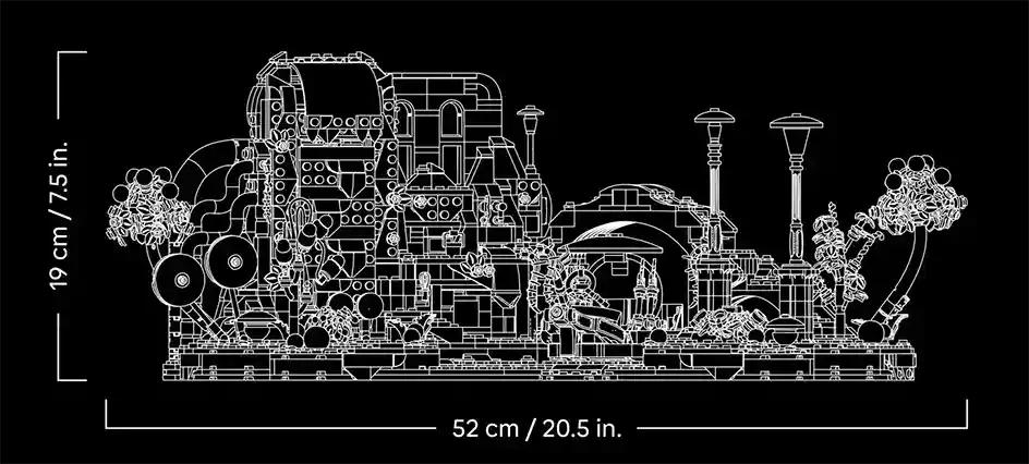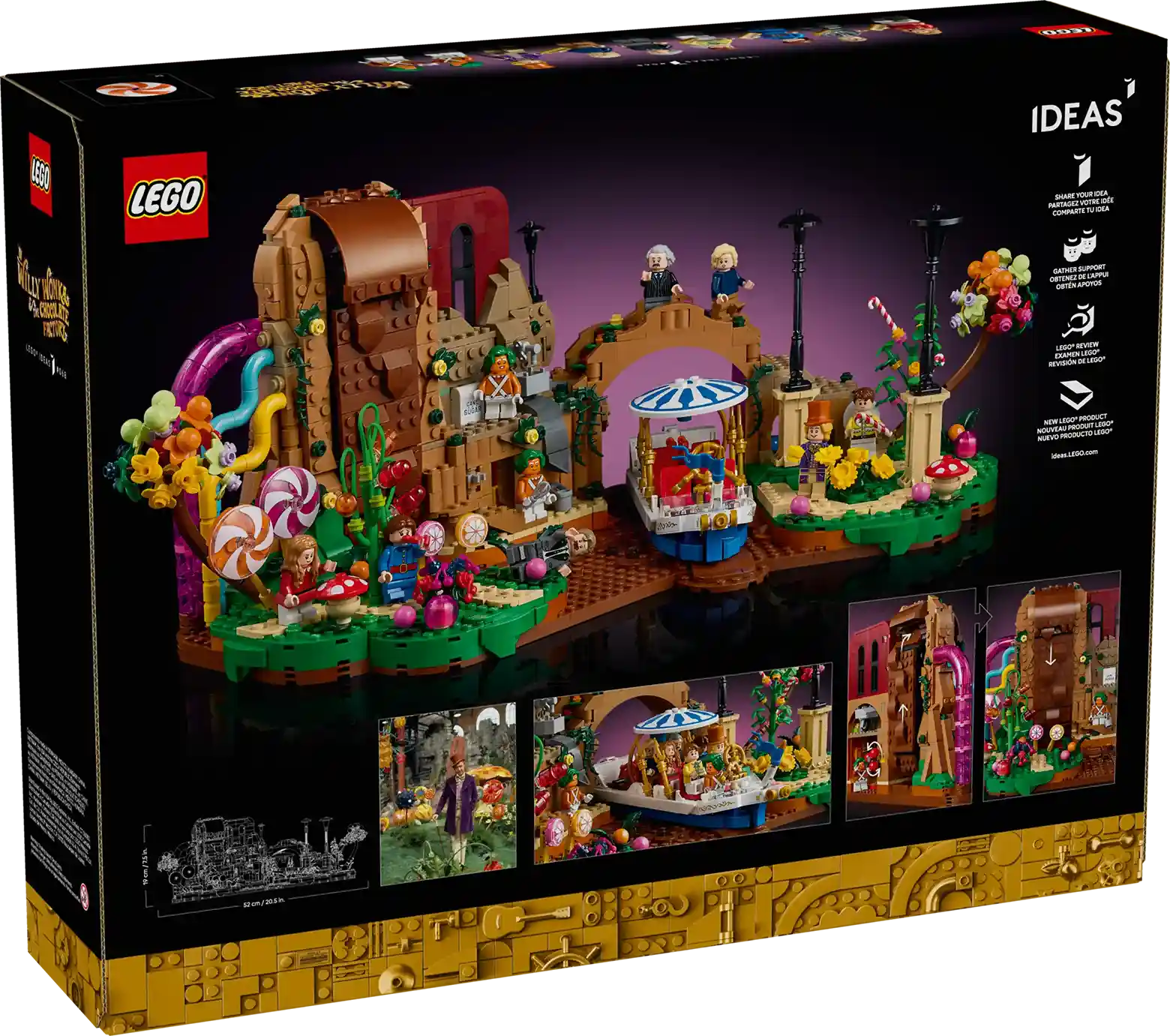 The Willy Wonka and the Chocolate Factory LEGO set has a substantial display size, measuring 19 cm (7.5 in.) tall and stretching 52 cm (20.5 in.) wide. Its wide footprint gives plenty of room to showcase the detailed Chocolate Room, including the flowing river, candy-filled landscape, and Wonkatania boat. The height allows the chocolate waterfall, bridge, and decorative elements to stand out, making the whole build feel like a fully realized scene from the movie.