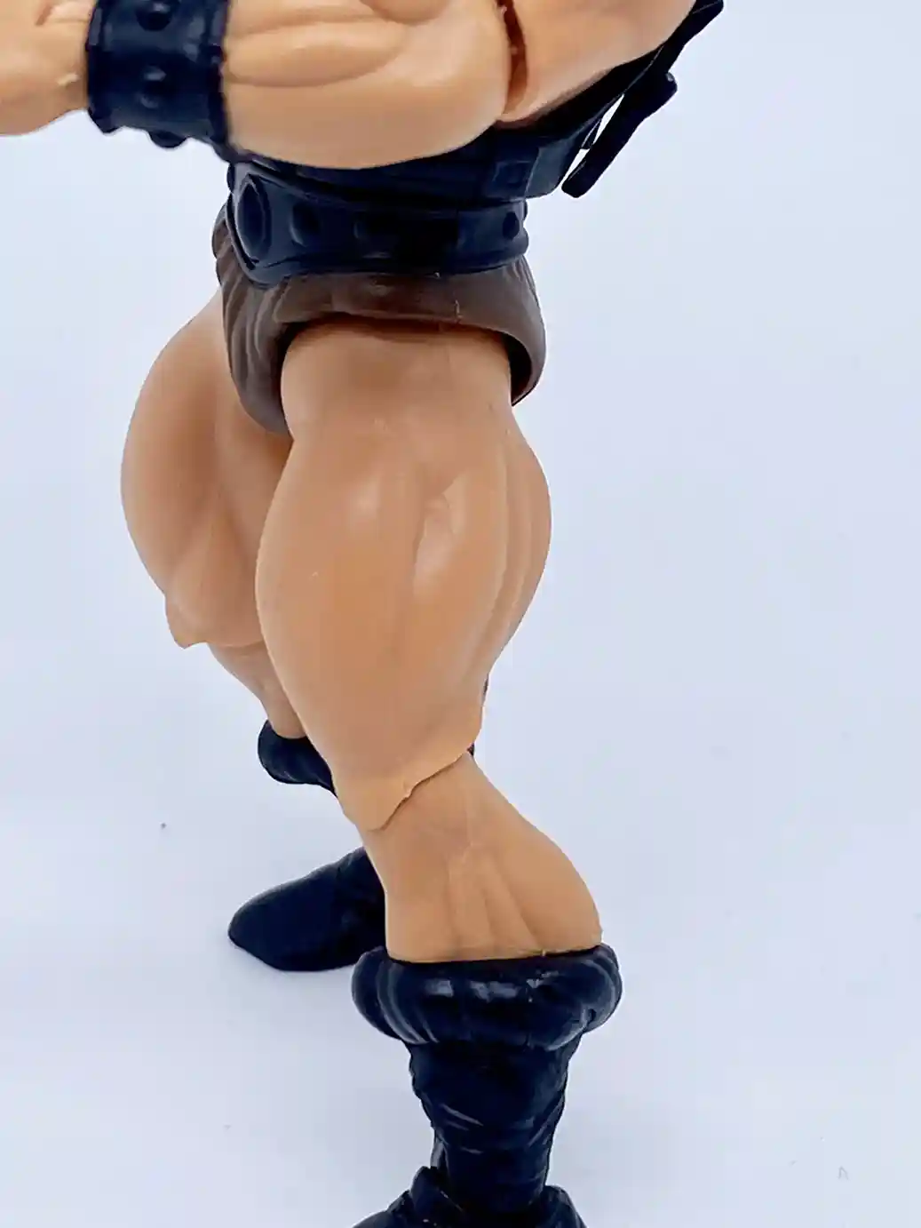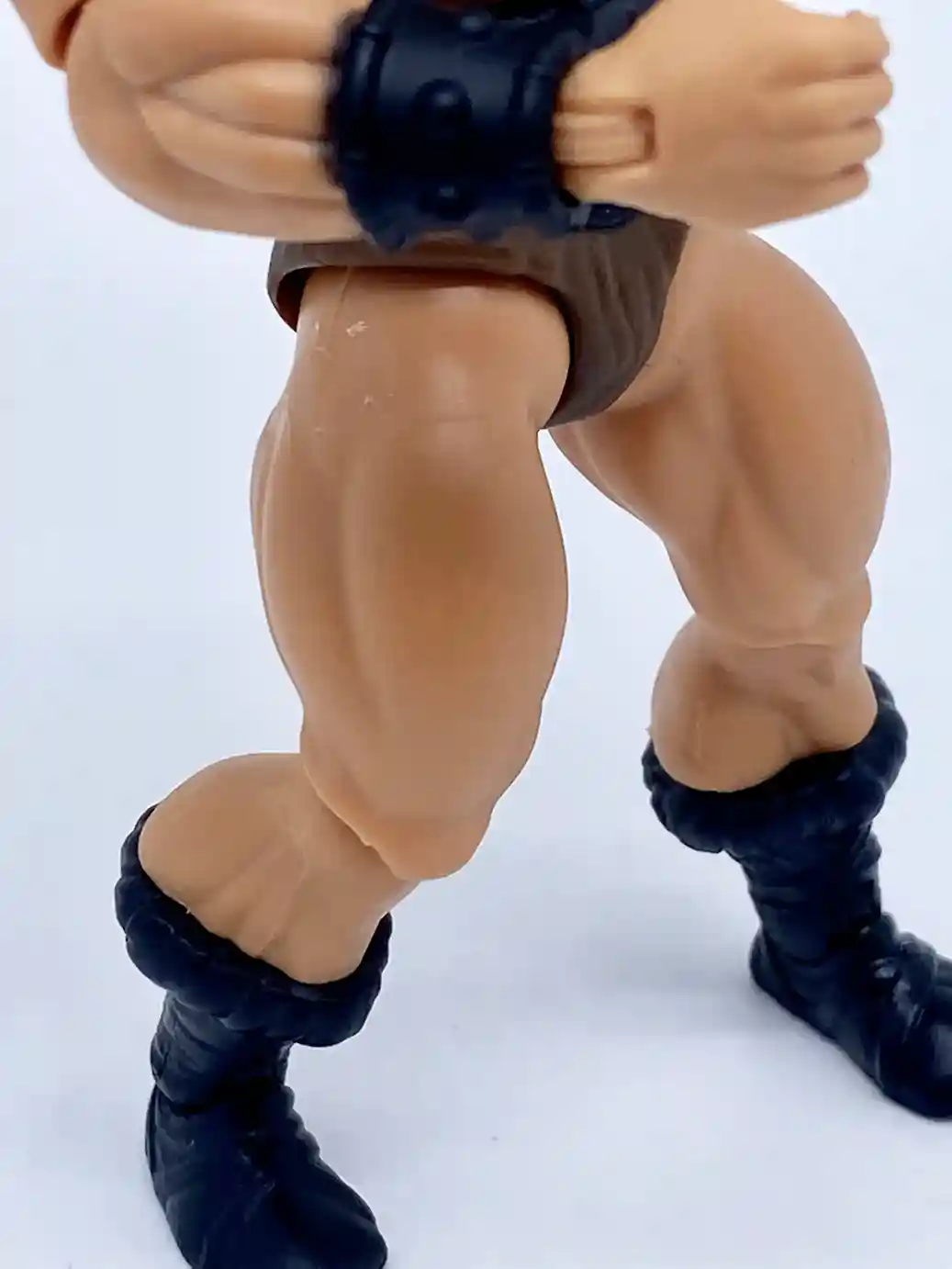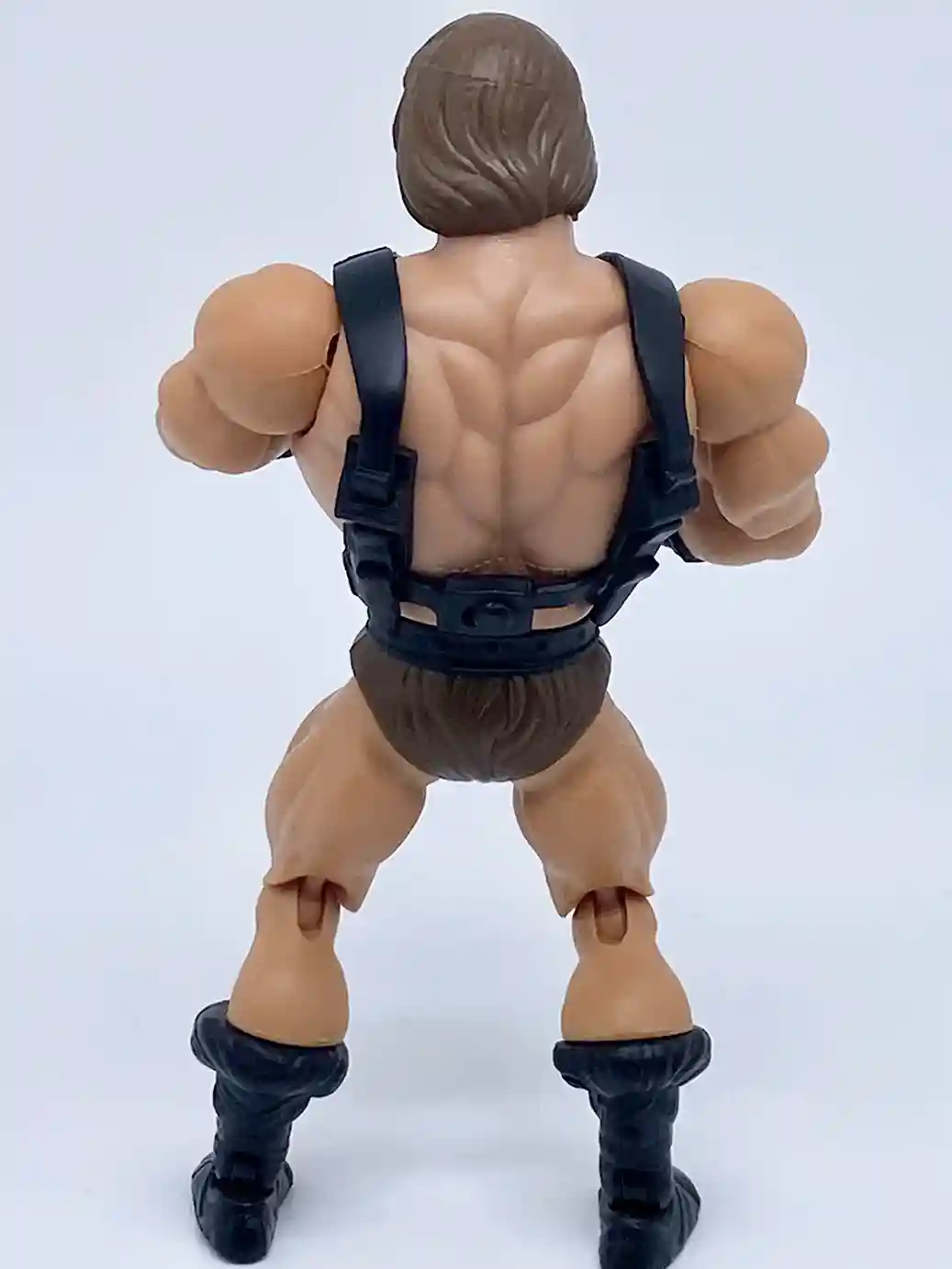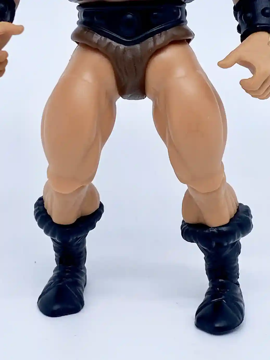 He is wearing the standard He-Man belt but in a matte black finish, and with standard brown furry shorts.