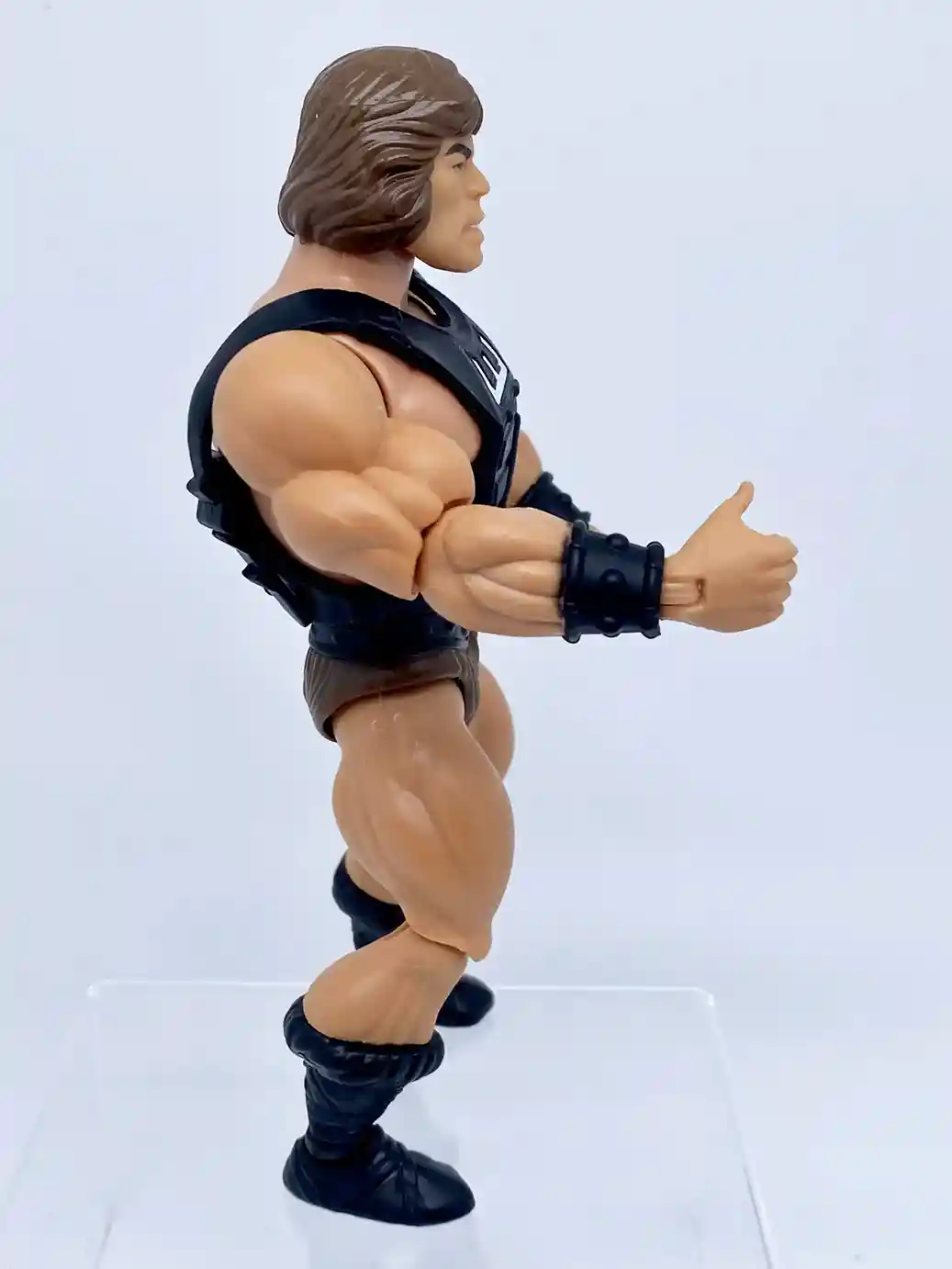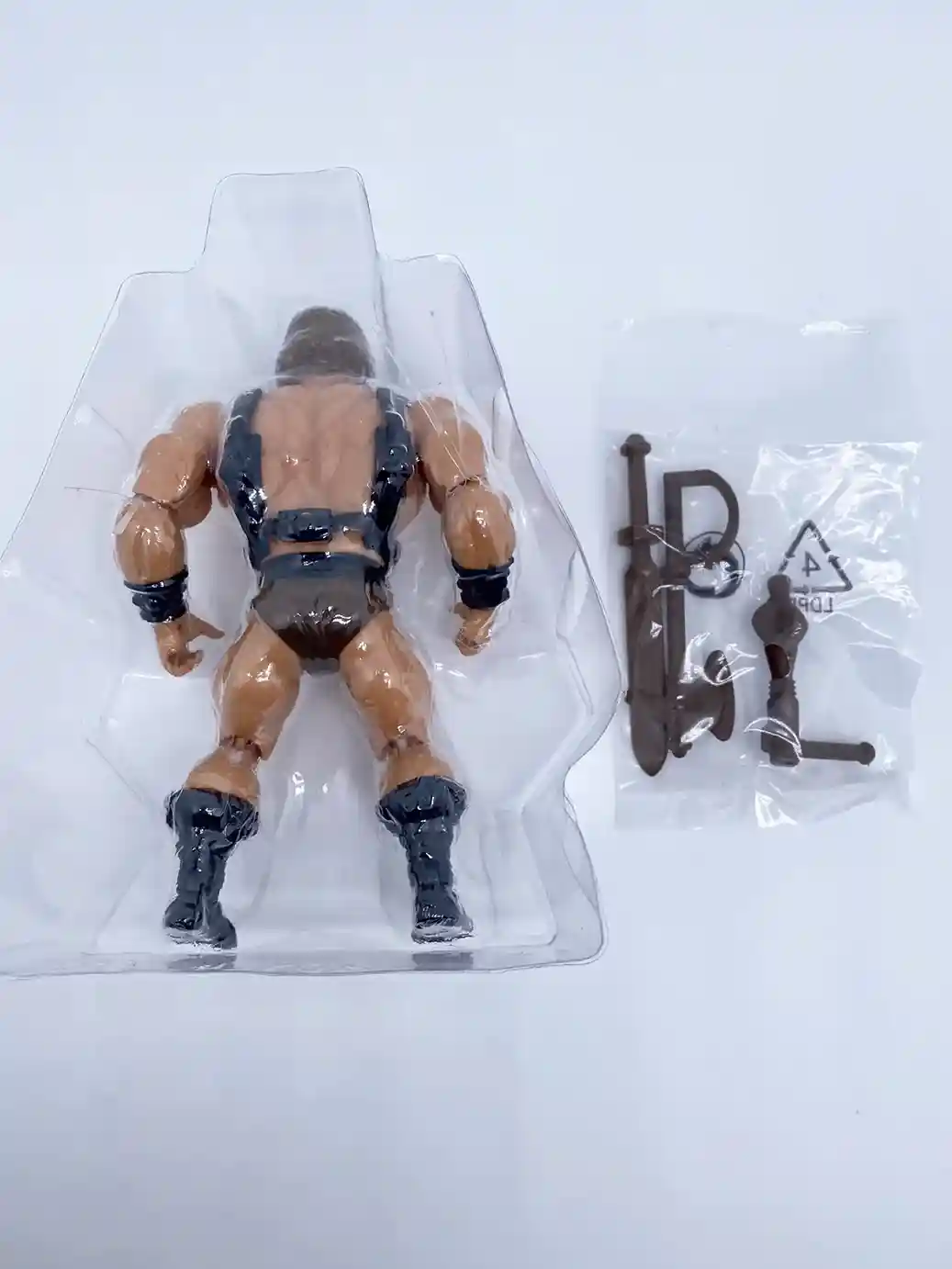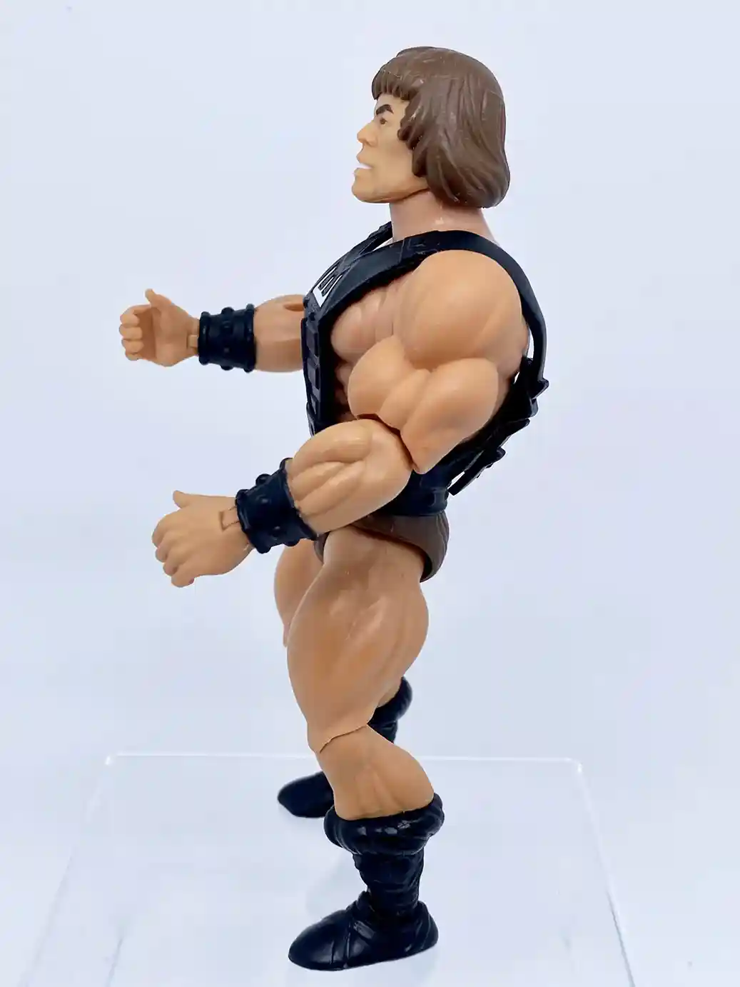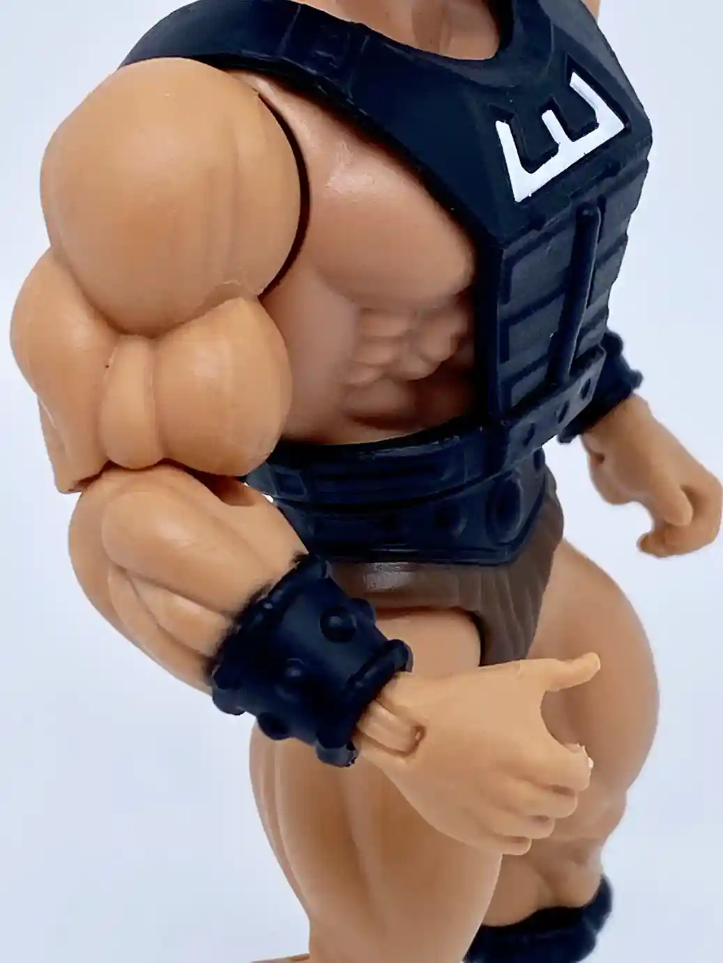 He is wearing the standard He-Man belt but in a matte black finish, and with standard brown furry shorts.