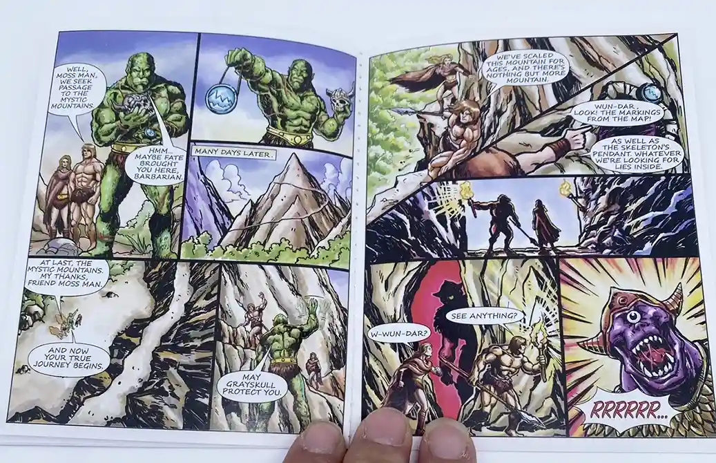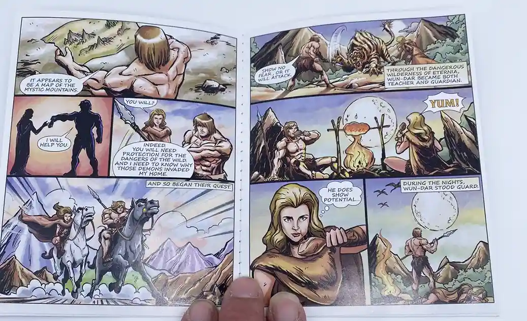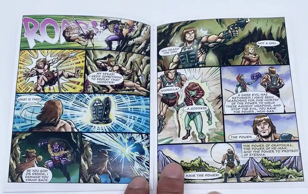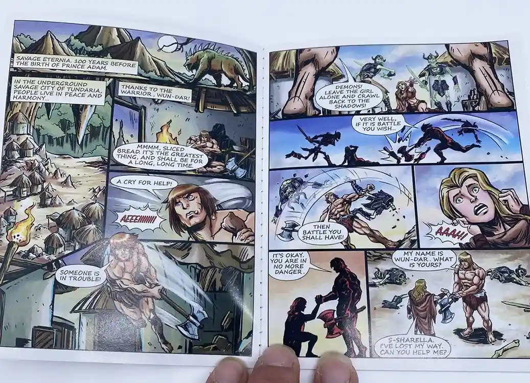 The mini comic starts out in Savage Eternia, 100 years before the birth of Price Adam. In the city of Tundaria, we see our hero eating a piece of sliced bread (love the nod to Wonder Bread! This is brilliant on Mattel’s part!). Wun-Dar suddenly hears a cry for help, and finds Skeleton demons attacking a girl. The funny thing in the comic Wun-Dar is swinging an axe that is more similar to He-Man’s style axe, then the one he comes packed with. He saves the girl name Sharella, which we later find out in MOTU lore that this is “The Goddess” of Etheria, an essential guardian of Grayskull. The Demon Skeletons attacked Sharella for her map, a map of the mystic mountains. Wun-Dar vows to help Sharella and find out why these demons attacked him home, so they set off to the Mystic Mountains. Throughout their journey, they encounter savages beasts, which Wun-Dar fends off. Sharella sees potential in him, but potential for what?