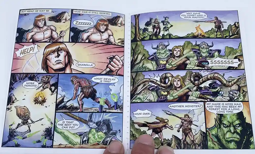 The mini comic packed inside with Wun-Dar is entitled “Lost Legend”. We will dive into a summary of the mini comic below as we are providing you with a view of every page. SPOILER ALERT!!! If you dont want to read the mini comic now, then skip over this section. We get a ton of new character teases in this mini-comic as well. It has Wun-Dar batting a purple Cyclops that has appeared on box art before. On the inside, Sharella and Moss-Man are also featured in the mini comic in the main story, which is great news as collectors have been clamoring for Moss Man in Origins. Be sure to look out for an upcoming article where we take a deep dive into the art teases from the Wun-Dar card back art and mini comic artwork.
