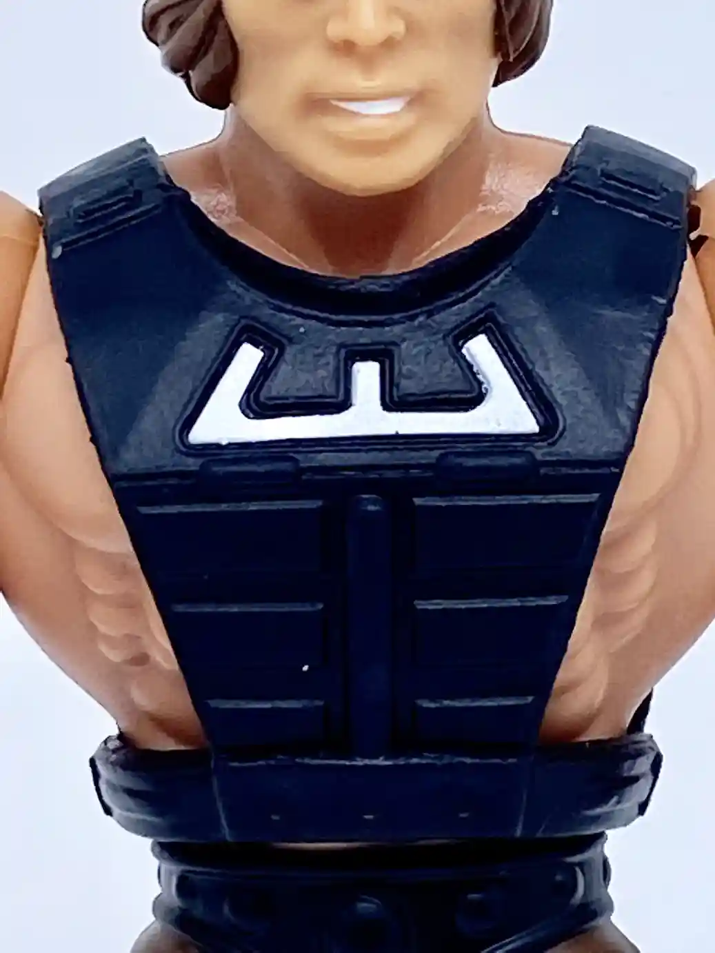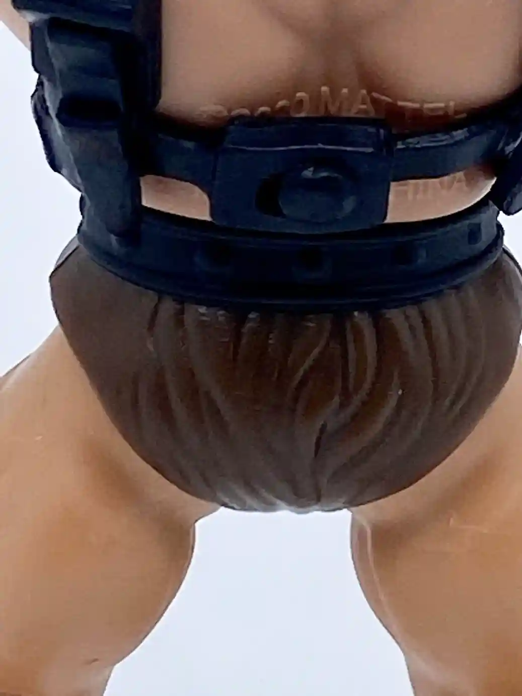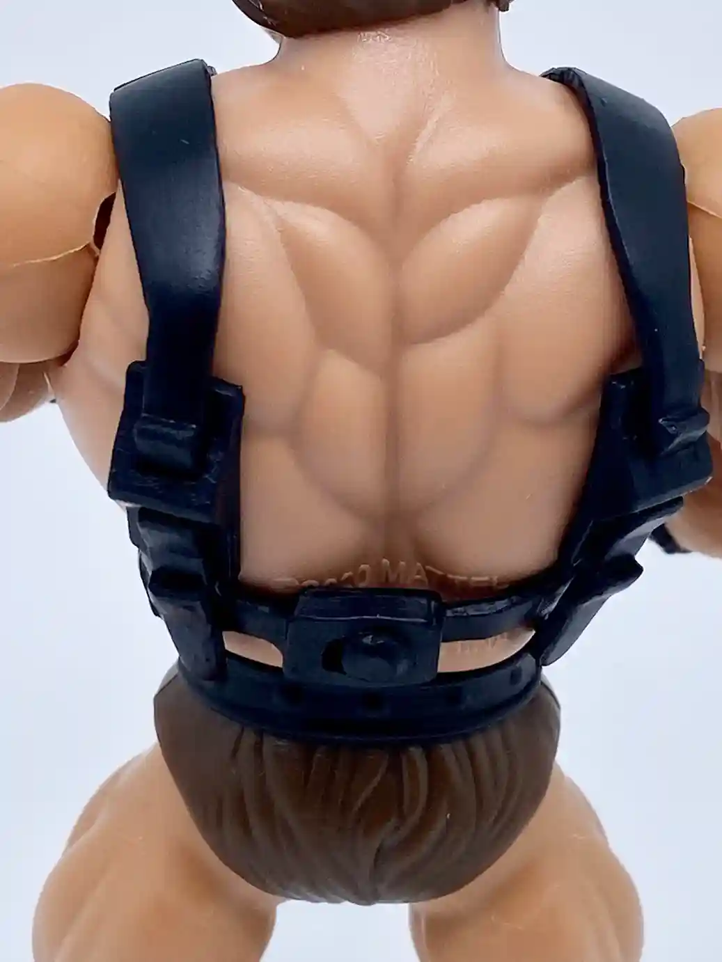 Wun-Dar’s chest armor is a reuse of Zodac’s chest armor but molded in black plastic instead of red. It has the “w” logo on the front, which I guess can stand for “Wun-Dar” and the typical straps in the back. Again, this is a reuse of the standard He-Man buck, but with a slightly browner skin tone. We can even see the Mattel production stamp on his back and it is still dated 2020!