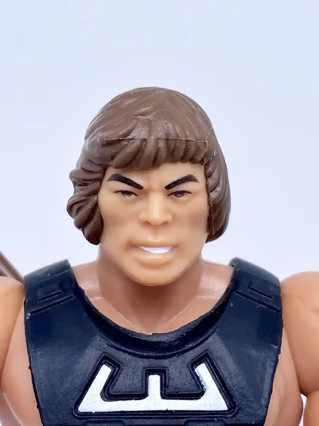 We can see that they have used the most recent version of the vintage He-Man head sculpt from the flying fist He-Man figure, which unfortunately on my version of Wun-Dar suffers from the same issue and is a bit loose on the neck peg. On this version for Wun-Dar, instead of blond He-Man, we get chocolaty brown colored hair, like a Hersey bar!