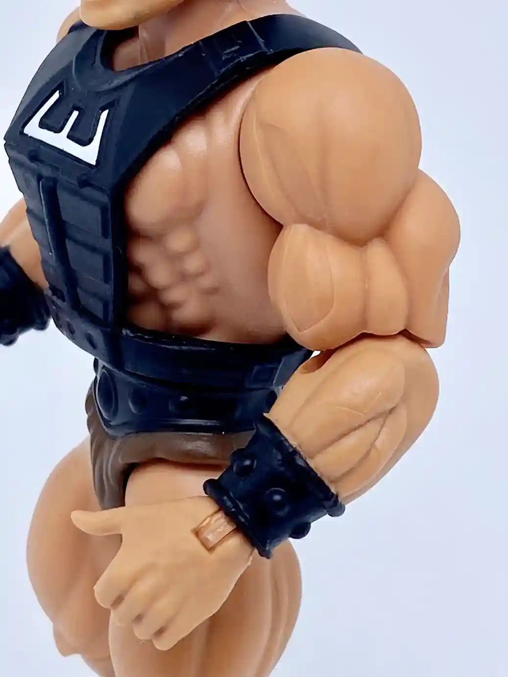 Wun-Dar’s arms are symmetrical and again a reuse of the standard He-Man muscular arms, but with a slightly browner skin tone and black colored wrist bracers. But I must say they look great on him. They are a matte black color and look more “rustic steel” like that way.