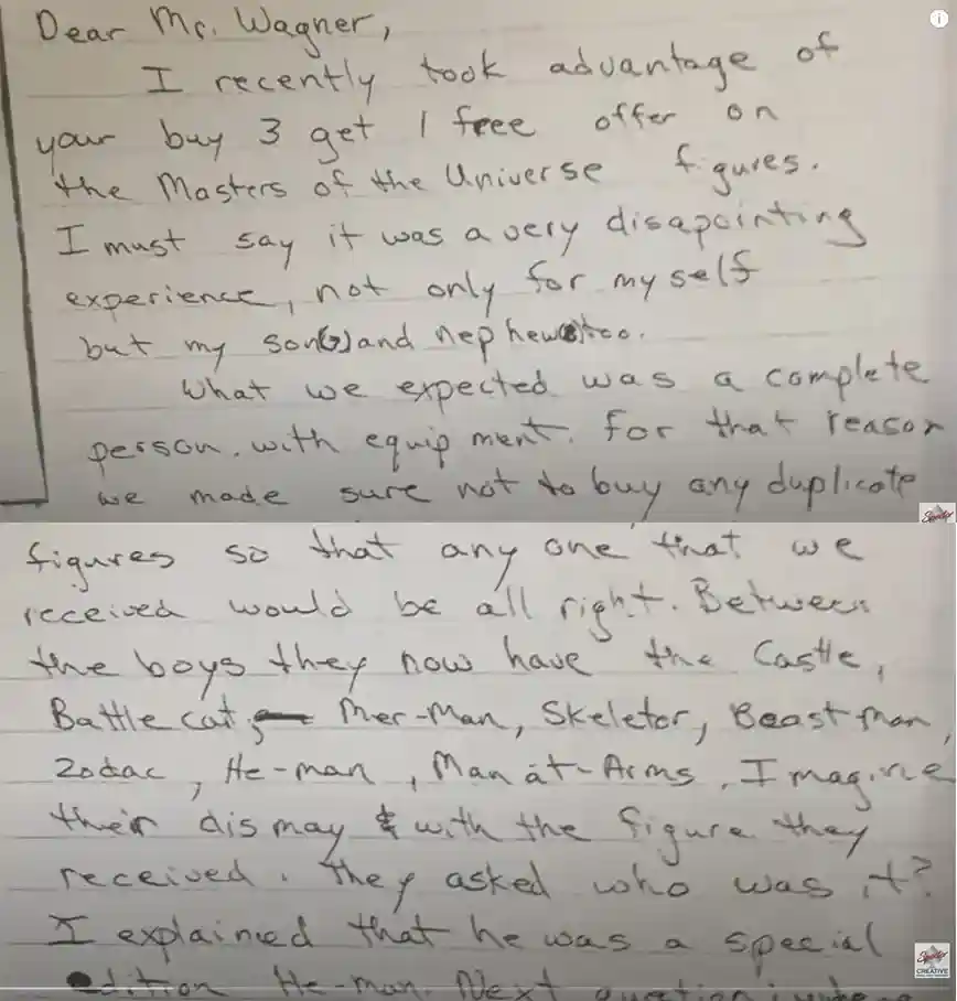 “I recently took advantage of your buy 3 get 1 free offer on Masters of the Universe figures. I must say it was a very disappointing experience not only for my myself but my son(s) and nephew too.