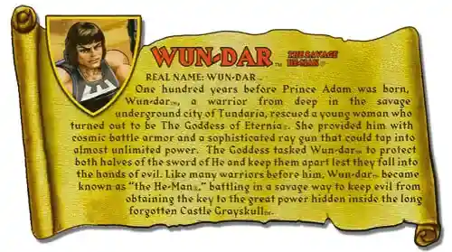 The figure of Wun-Dar is an homage to the original promotional figure given away through the mail in 1981. In the late 1990s an unusual repaint of He-Man began appearing on eBay. He sported the same color scheme that Wun-Dar would come to have.
