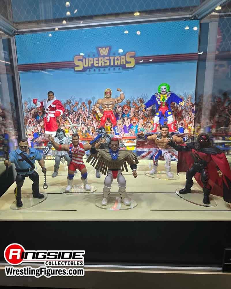 Wrestlemania is the showcase of immortals and the most important event in WWE! Over the course of time, Wrestlemania as not only given fans access to to WWE wrestlers but Mattel is also using the event to showcase future figures. Before the booth reveals, we knew that the Big Bossman, Kurt Angle and Tatanka were coming to the WWE Superstars line as the listings were discovered in Walmart’s databases. We also discovered test shots of Tatanka and Kurt Angle as further confirmation. In the glass display case, we can see confirmation of this plus some new Superstars are also showcased! Special thanks to ringsidec for posting these images and to