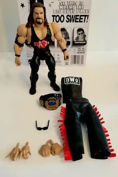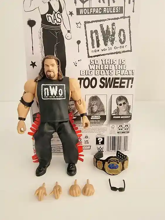 Kevin Nash is dressed in his classic nWo removeable tank top and when removed reveals the “Nash” logo in red on his wrestling shirt below. He also includes red fringed black “leather” pants that can also be removed to reveal his black wrestling pants and matching black boots below. He includes a black elbow strap, and wrist straps. He includes 2 additional sets of hands, the first are fists and the second set are posed in his signature hand gesture. He also includes a black WCW wrestling belt and black sunglasses! This Big Boy is rockin’ his classic nWo outfit!