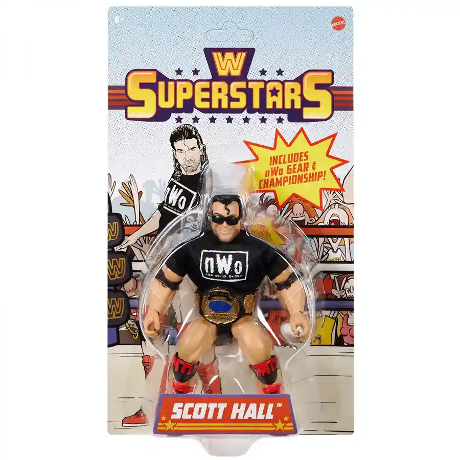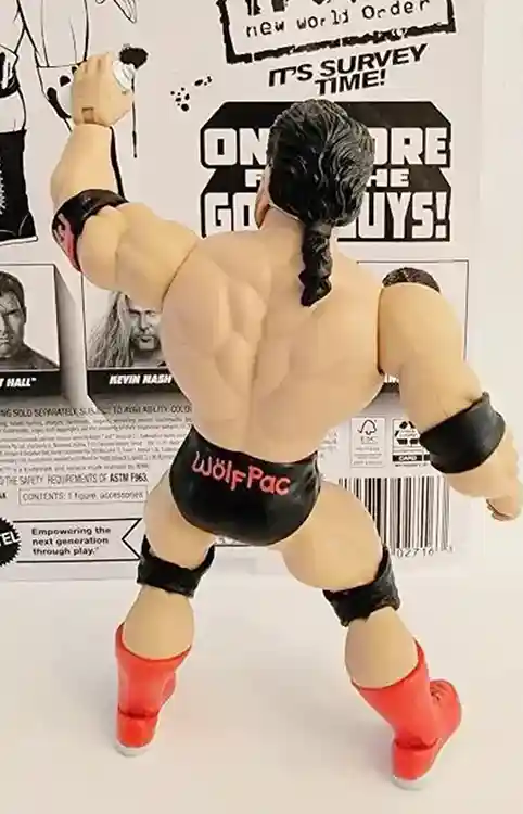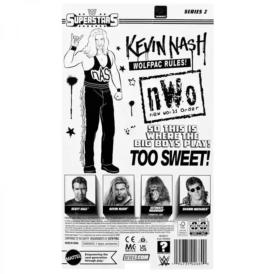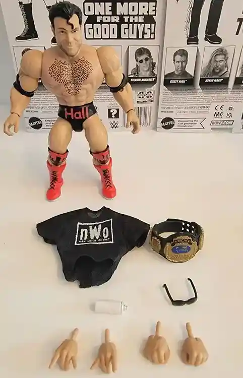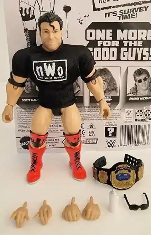Shawn Michaels, Kevin Nash, Scott Hall (sans the Ultimate Warrior) make up this wave where we get two more NWO members to join Hulk Hogan from Series 1 plus the Heartbreak Kid, one of the best sports entertainers in the business. These figures come packed with a gaggle of accessories, including ring attire that is removable, and unlike the MOTWWE line, is soft goods! There are many ways to display this fun set from their entrance garb to their in ring looks so let’s check out the figures in more detail and learn some history (I know yuck but this lesson is fun we promise)!