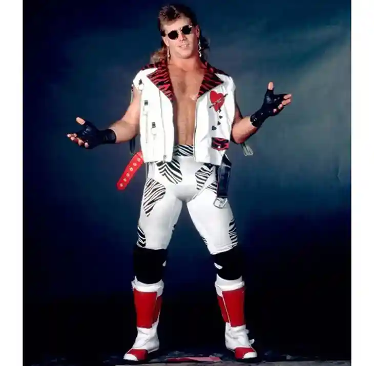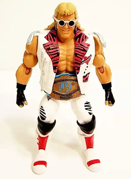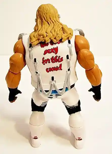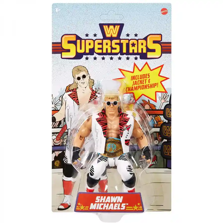 Shawn Michael’s features one his classic and iconic white zebra’esque ring attire with the red lapels on his jacket with the chains on the back. He’s wearing his signature earrings, black fingerless gloves, black knee pads and white and red boots. He includes a teal-colored championship belt, as set of alternate fists and sunglasses. Shawn’s entire ensemble is classic 1980’s Shawn Michaels! They nailed it to giving him his signature look.