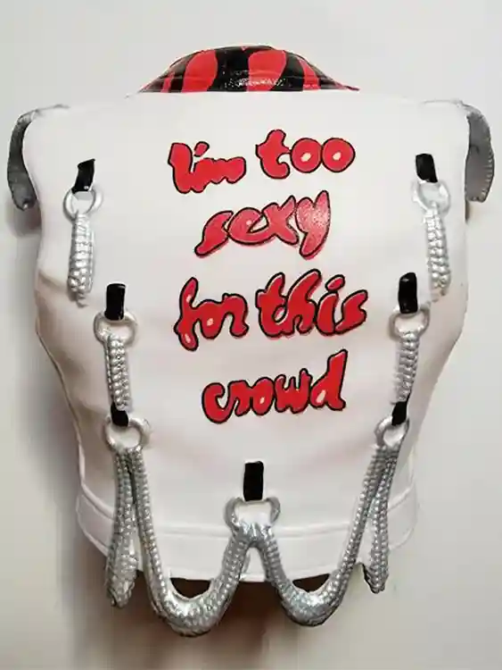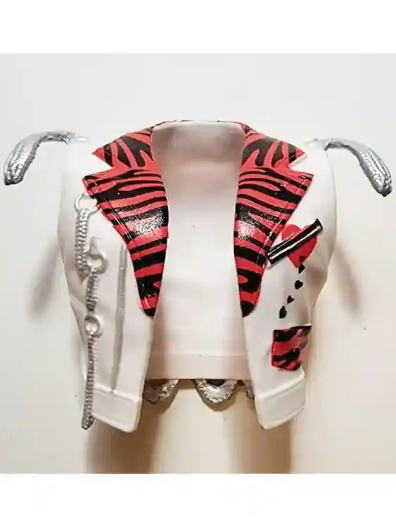 Taking a closer look at the jacket, it has the zippers and chains that were on the original Shawn Michael’s ring attire. They’ve recreated this nicely and they even thought to add the black hearts flowing down from the large red heart on the left breast of the jacket.