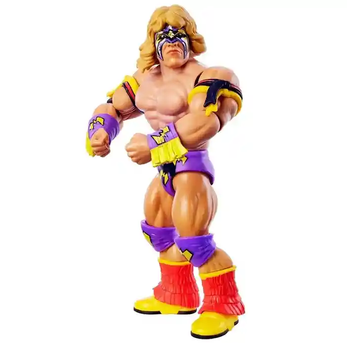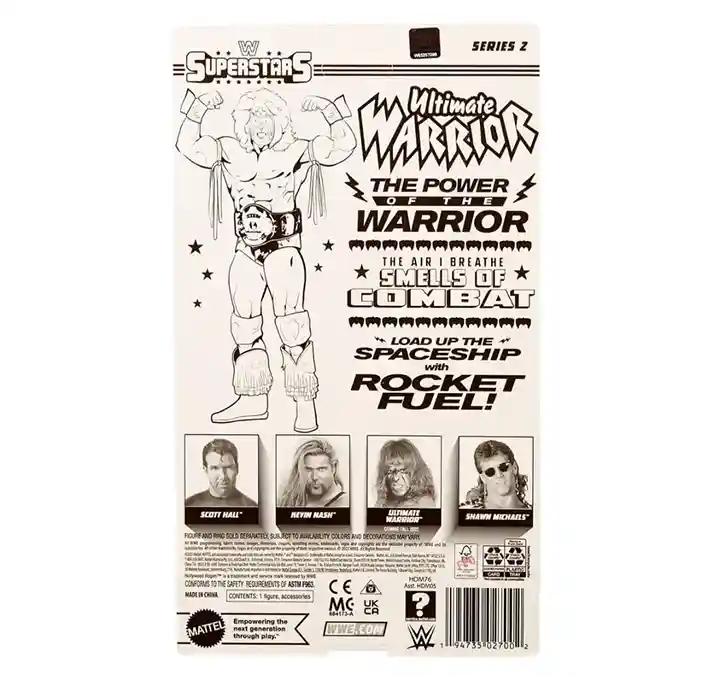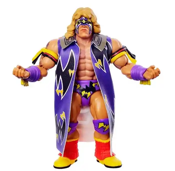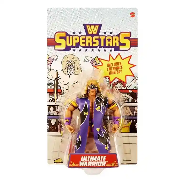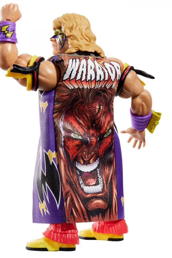Originally slotted to be part of Series 2, this retro version of the Ultimate Warrior WWE Superstars action figure looks amazing and comes to us in this third wave! Get ready to load up the spaceship with rocket fuel! Ultimate Warrior comes on a beautiful retro style card back featuring the 1980’s style WWE Superstars logo and awesome looking art on both the front and back. In classic Ultimate Warrior style, he is dressed in his signature purple wrestling cape with amazing Ultimate Warrior graphics on the front and a crazy warrior face graphic on the back! He is in purple, gold and black face paint color scheme, and comes wearing red, black and yellow bicep straps, purple and yellow wrist wraps, and matching knee pads and shorts. His boots are yellow with red fringe. Warrior even includes a tattoo on his right shoulder. He even includes 2 additional pairs of alternate hands: 2 open hands and 2 closed hands.