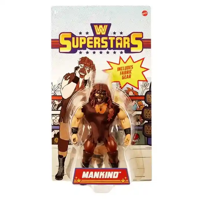 Retro style meets in-ring action with WWE Superstars Mankind action figure, standing approx. 5.5-inches tall. Featuring the same look as muscly figures from the 1980’s, twist these WWE figures into different action-packed match poses. Each Superstar figure includes iconic accessories, from entrance gear to championship titles. Fans can collect WWE and WCW legends, as well as Superstars from RAW and Smackdown.