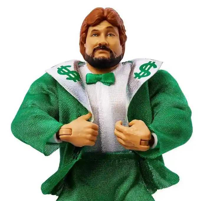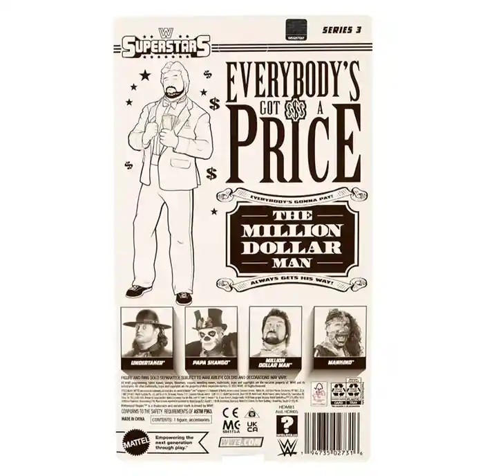 The Million Dollar Man Ted Dibiase is dressed for success in his money maker green power suit! His card back also comes in the same retro style packaging featuring the 1980’s style WWE Superstars logo and amazing looking art on both the front and back, stating ” Everybody’s got a price!” Million Dollar man comes dressed in his green and white full fabric entrance suit, with green pants, a white shirt, green bow tie and a green suit jacket complete with silver collars and green dollar signs. He comes packed with plastic money so he can brag how rich he is to his opponents in the ring. He also includes 2 additional pairs of alternate hands: 2 open hands and 2 closed hands.