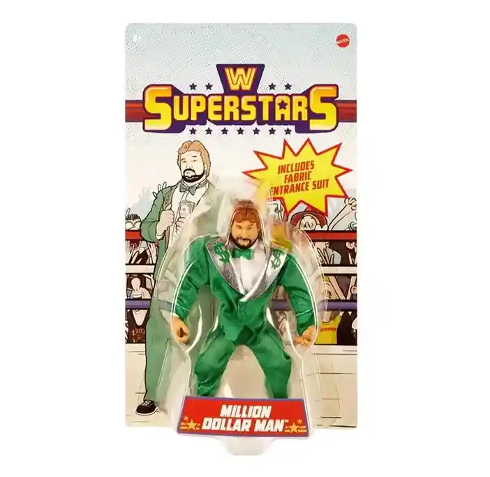 Recreate legendary in-ring moments with the retro-style WWE Superstars Million Dollar Man action figure! Each figure stands 5.5-inches tall in a muscular form factor signature to 1980’s action figures with modern articulation and includes soft goods entrance gear and signature accessories. Each Superstar figure includes iconic accessories, from entrance gear to championship titles. Collectors and kids can add their favorite WWE Superstars past and present to their collection.