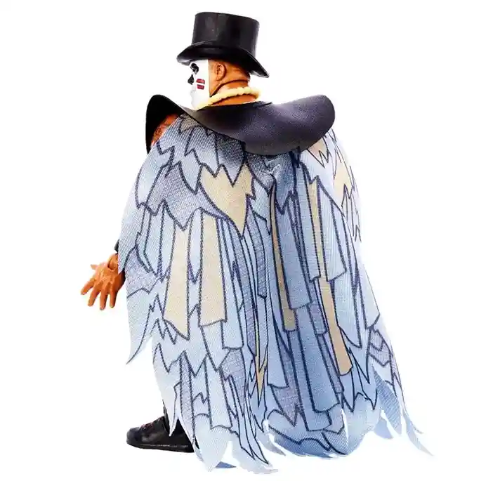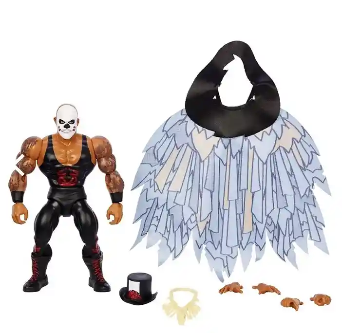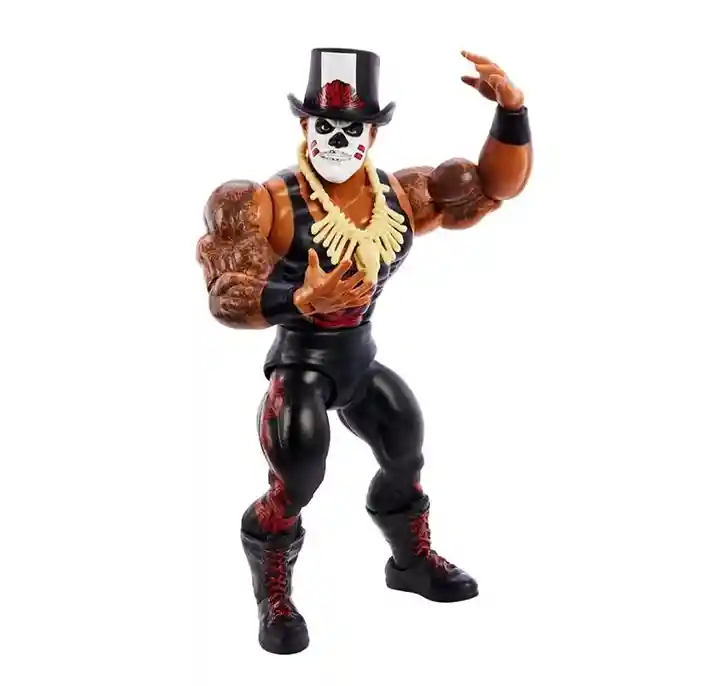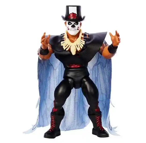 The spell has been put on you as you will be spell bound when you check out this new Papa Shango Series 3 WWE Superstar action figure! He comes with amazingly detailed tattoos all over his arms, crazy witch doctor face paint, a bone necklace, black wrist straps, black boots with red laces, black wrestling outfit with red floral accents, a black top hat with classic Papa Shango logo and a fantastic feather patterned cape! He also includes 2 additional pairs of alternate hands: 2 open hands and 2 closed hands. Papa Shango is definitely sporting his retro look in this new highly detailed series 3 figure!