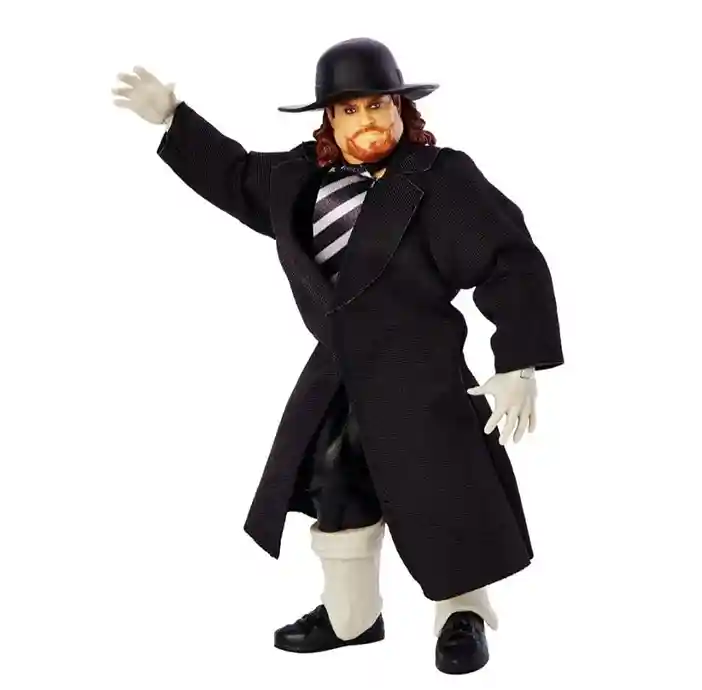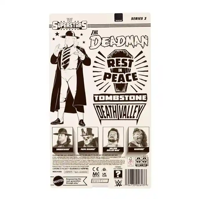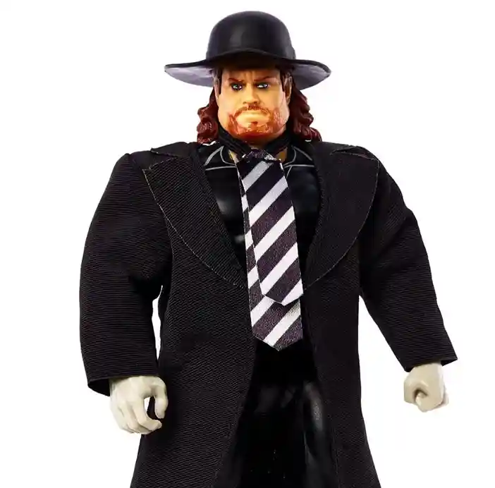 Known as “The Deadman”, this Undertaker retro style Series 3 action figure is dressed to kill in his classic paul bearer’s outfit. Wearing white gloves, black trench coat, stripped wide tie, black and white boots and classic black undertaker’s hat! This version of the Undertaker really plays on that classic signature 1980’s look we all remember. He also includes 2 additional pairs of alternate white gloved hands: 2 open hands and 2 closed hands.