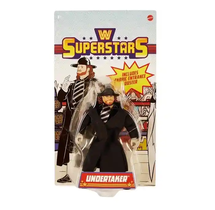 Retro style meets in-ring action with WWE Superstars Undertaker action figure, standing approx. 5.5-inches tall. Featuring the same look as muscly figures from the 1980’s, twist these WWE figures into different action-packed match poses. Each Superstar figure includes iconic accessories, from entrance gear to championship titles. Fans can collect WWE and WCW legends, as well as Superstars from RAW and Smackdown.