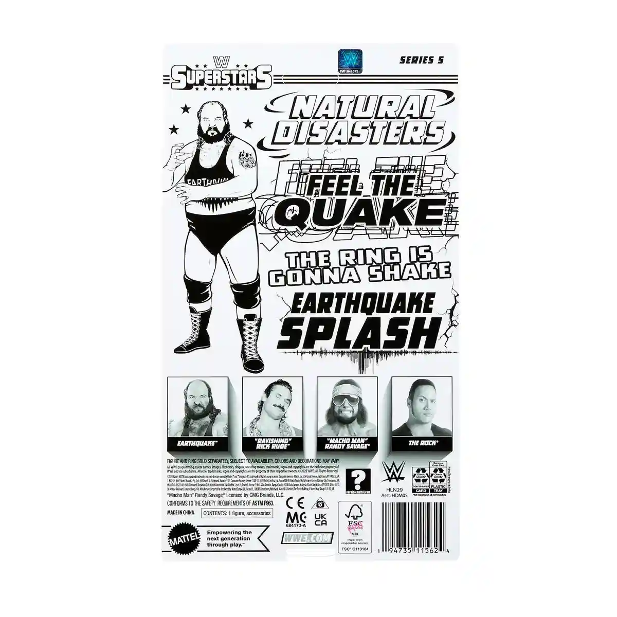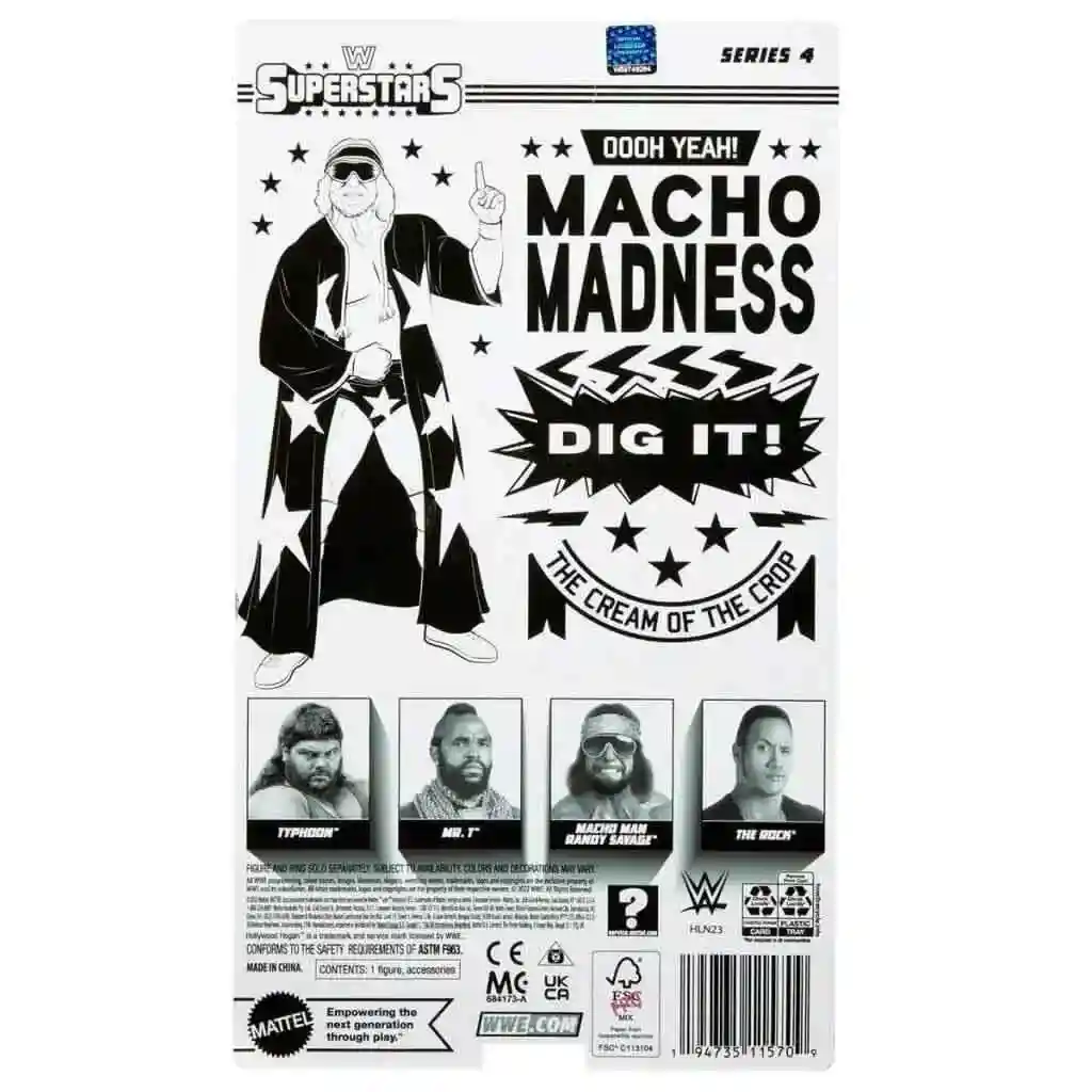 There were 6 WWE Superstars figures revealed at SDCC 2022 and according to the back of the packaging that revealed back on September 1, 2022, Series 4 consisted of Typhoon, Mr. T, Macho Man Randy Savage, and The Rock! BUT…according to images of Ravishing Rick Rude and Earthquake posted on WWE.com, Macho Man Randy Savage and The Rock will also be in Series 5, making 6 figures across Series 4 and 5, instead of the usual 4 figures per series.