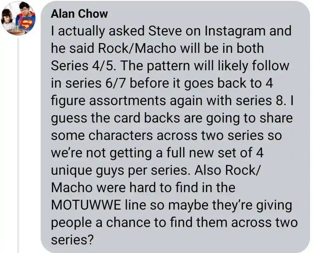 I actually asked Steve on Instagram and he said Rock/Macho will be in both Series 4/5. The pattern will likely follow in series 6/7 before it goes back to 4 figure assortments again with series 8. I guess the card backs are going to share some characters across two series so we’re not getting a full new set of 4 unique guys per series. Also Rock/Macho were hard to find in the MOTUWWE line so maybe they’re giving people a chance to find them across two series?