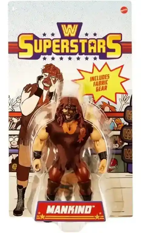 Retro style meets in-ring action with WWE Superstars Mankind action figure, standing approx. 5.5-inches tall. Featuring the same look as muscly figures from the 1980’s, twist these WWE figures into different action-packed match poses. Each Superstar figure includes iconic accessories, from entrance gear to championship titles. Fans can collect WWE and WCW legends, as well as Superstars from RAW and Smackdown.