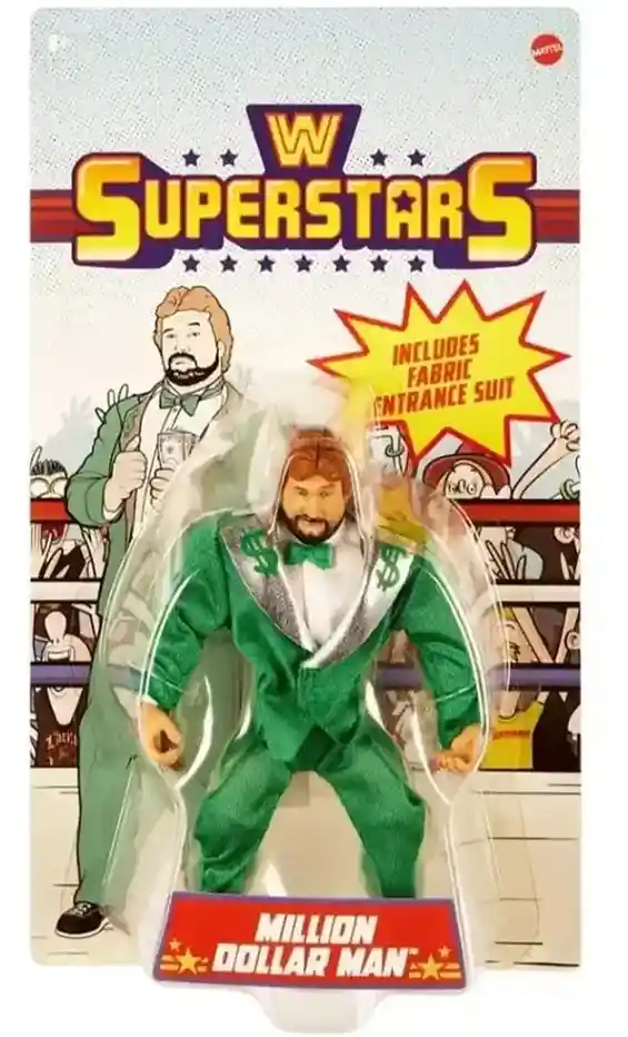 Recreate legendary in-ring moments with the retro-style WWE Superstars Million Dollar Man action figure! Each figure stands 5.5-inches tall in a muscular form factor signature to 1980’s action figures with modern articulation and includes soft goods entrance gear and signature accessories. Each Superstar figure includes iconic accessories, from entrance gear to championship titles. Collectors and kids can add their favorite WWE Superstars past and present to their collection.