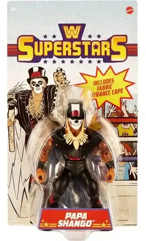 Recreate legendary in-ring moments with the retro-style WWE Superstars Papa Shango action figure! Each figure stands 5.5-inches tall in a muscular form factor signature to 1980’s action figures with modern articulation and includes soft goods entrance gear and signature accessories. Each Superstar figure includes iconic accessories, from entrance gear to championship titles. Collectors and kids can add their favorite WWE Superstars past and present to their collection.