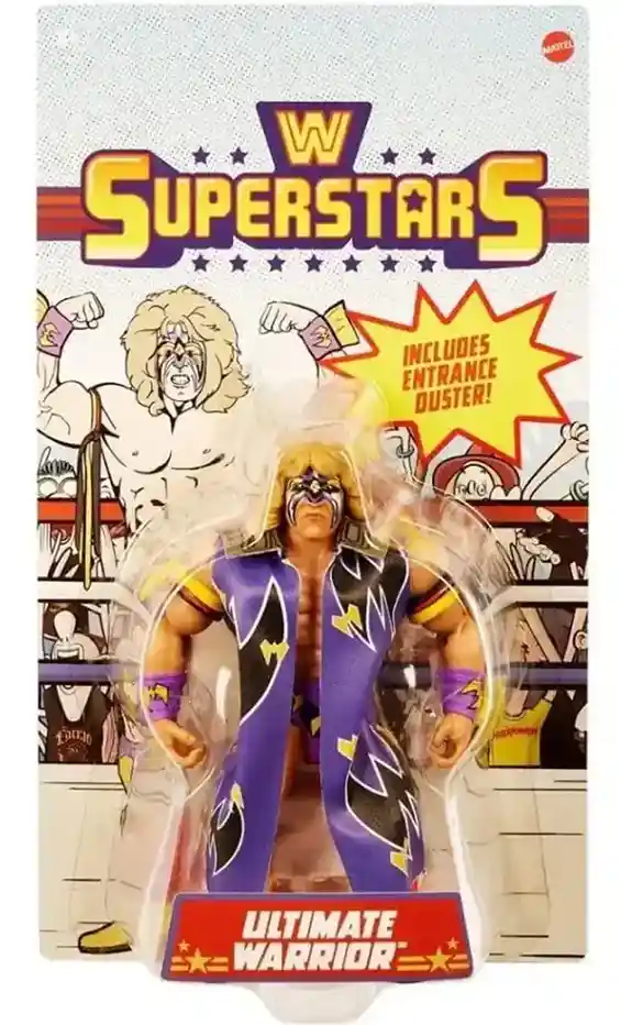 Originally slotted to be part of Series 2, this retro version of the Ultimate Warrior WWE Superstars action figure looks amazing and comes to us in this third wave! Get ready to load up the spaceship with rocket fuel! Ultimate Warrior comes on a beautiful retro style card back featuring the 1980’s style WWE Superstars logo and awesome looking art on both the front and back. In classic Ultimate Warrior style, he is dressed in his signature purple wrestling cape with amazing Ultimate Warrior graphics on the front and a crazy warrior face graphic on the back! He is in purple, gold and black face paint color scheme, and comes wearing red, black and yellow bicep straps, purple and yellow wrist wraps, and matching knee pads and shorts. His boots are yellow with red fringe. Warrior even includes a tattoo on his right shoulder. He even includes 2 additional pairs of alternate hands: 2 open hands and 2 closed hands.