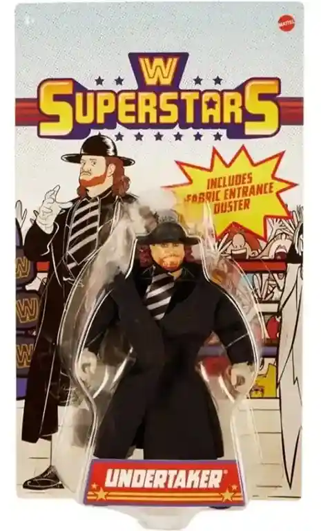 Retro style meets in-ring action with WWE Superstars Undertaker action figure, standing approx. 5.5-inches tall. Featuring the same look as muscly figures from the 1980’s, twist these WWE figures into different action-packed match poses. Each Superstar figure includes iconic accessories, from entrance gear to championship titles. Fans can collect WWE and WCW legends, as well as Superstars from RAW and Smackdown.