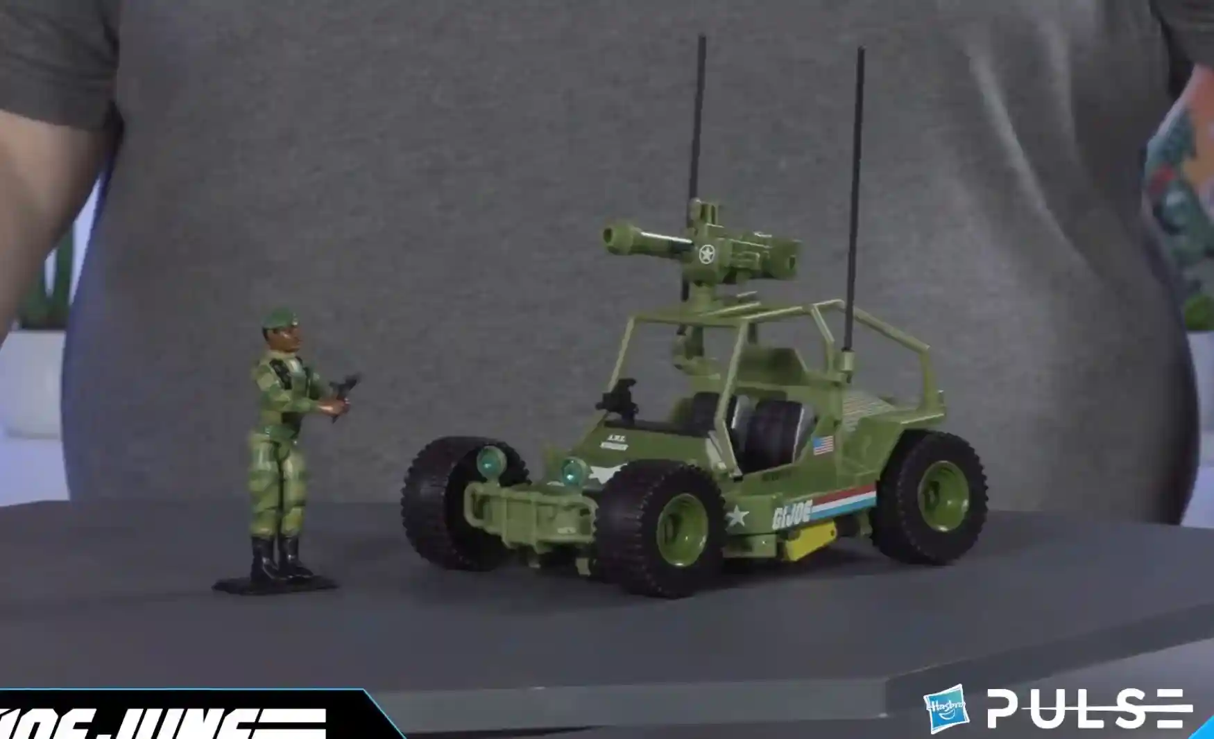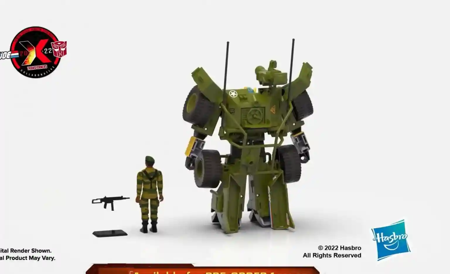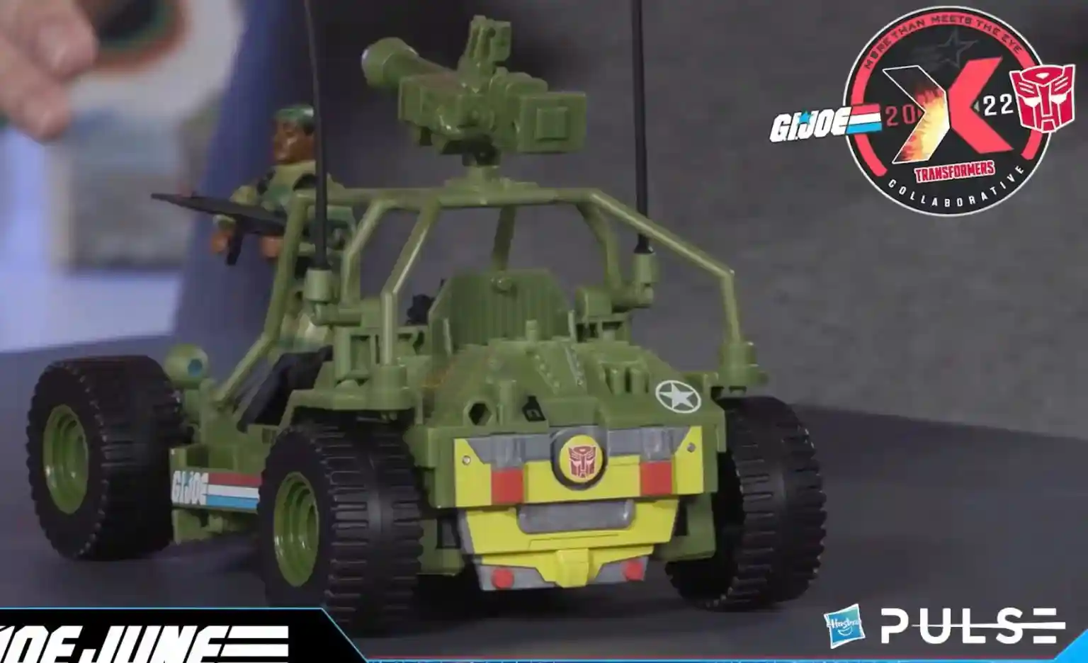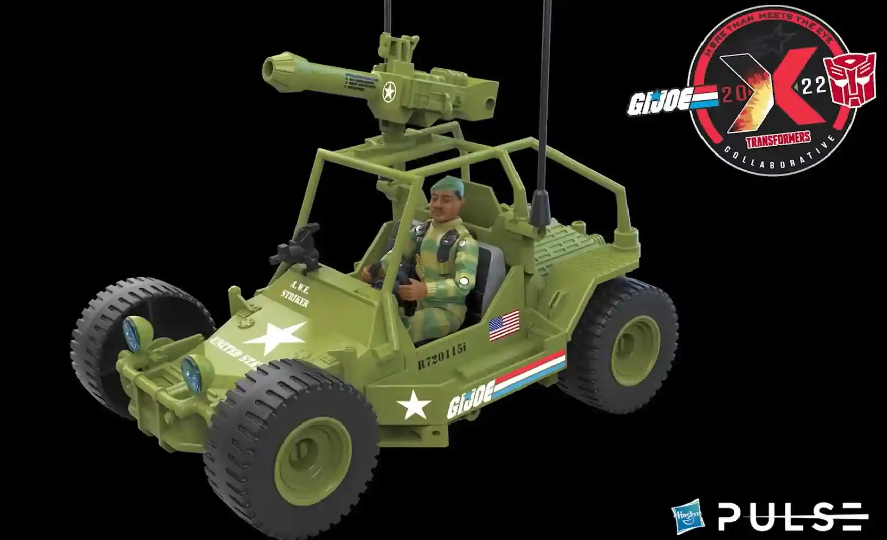 This new GI Joe Transformer Collaboration project just knocked my socks off!!! We are getting a freakin’ A.W.E Striker with 1983 Vintage O-Ring Stalker Transformer Collaboration Set! The Transformer is none other than Bumblebee, as we predicted in our previous article! The A.W.E Striker is a perfect tribute to the vintage version with Bumblee hidden inside! You can seat 2 figures riding in A.W.E Striker and comes complete with side boards and foot pegs to add additional Joes riding on the sides! It has the classic big green blaster on top as well/ The blaster comes off at the top of the A.W.E Striker. Antenna moves, Stalker can ride inside and stand on back and fire the large blaster and also includes the classic front headlights. You can also have Stalker ride in back of Bumblebee when he is in his transformed form!