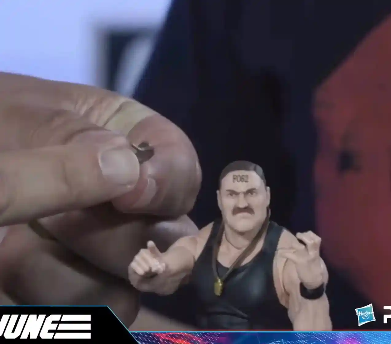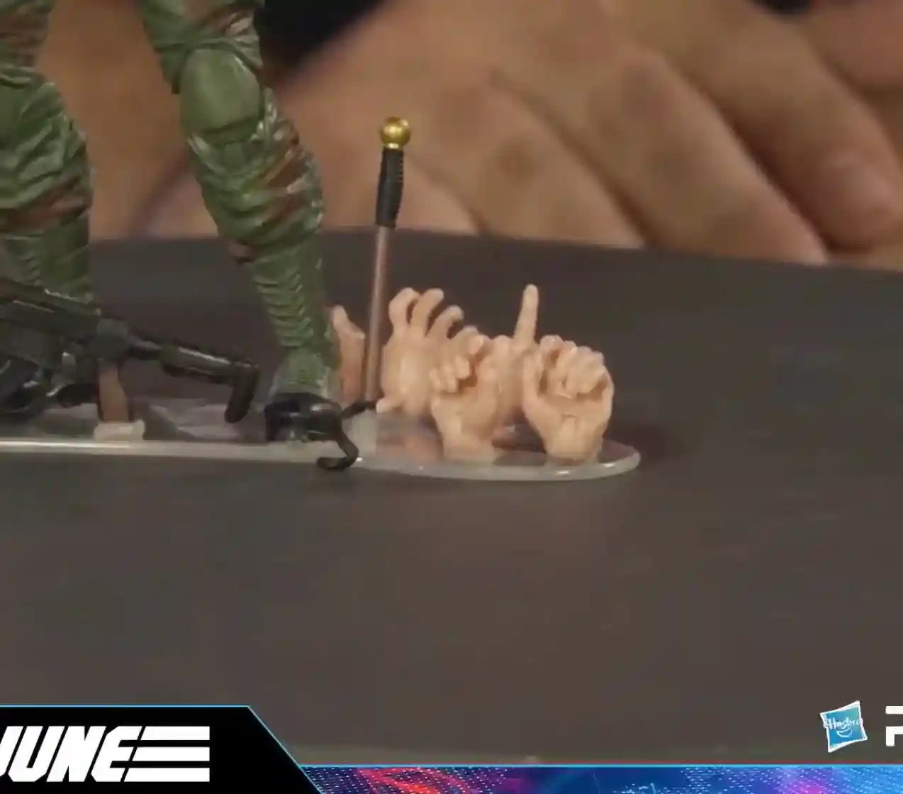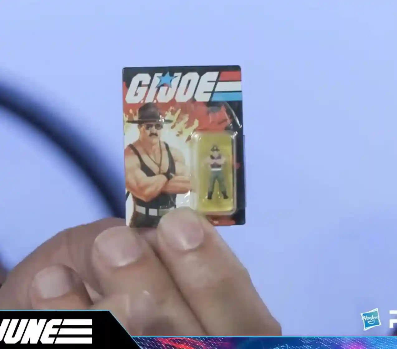 Well today we got to see a diorama shots of Sgt Slaughter, which looked amazing! We also got to see his special accessory that Lenny teased us with last time; A teeny Tiny Sgt Slaughter for him to hold! This is so you can recreate the 1980’s commercials we used to see as kids, like he is selling a Joe figure. He also showed us a mock-up of the Mini Sarge comes on a mini-Sarge card back with retro artwork! Sarge comes with multiple sets of hands, his baton, rifle, drill Sargent whistle and removable hat and removable sunglasses. His face sculpt harkens back to his younger self and cartoon look. Sarge is dressed in his classic black tank top, green camo pants, and white belt. Lenny mentioned that the wall thickness on hat was made as thin as possible to fit properly.