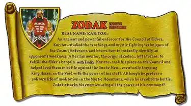 Zodac is an enigmatic cosmic enforcer in the Masters of the Universe mythos. In general, the character is portrayed as being neutral in the battle between good and evil. However, the difficulty in presenting such nuance in a children’s toy line has led to inconsistencies in his character across various forms of continuity.